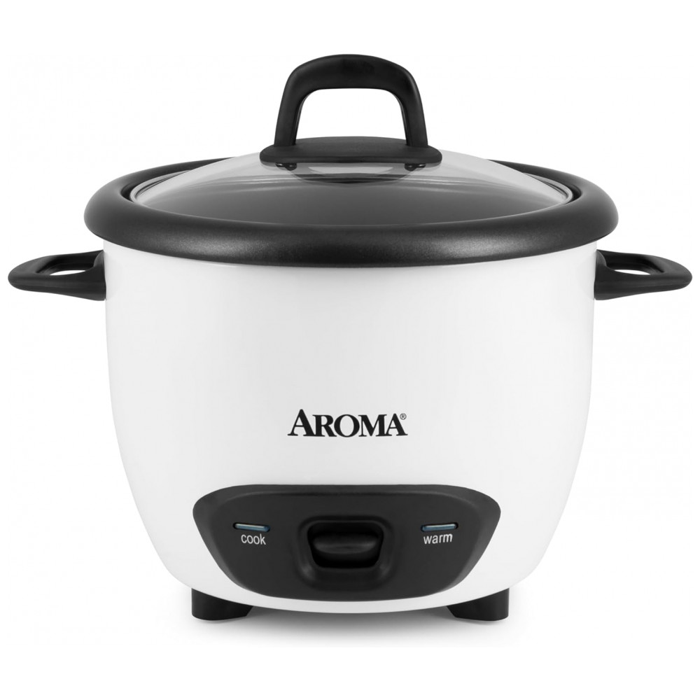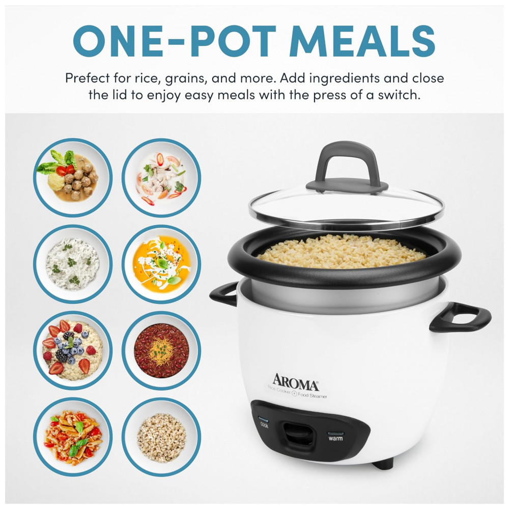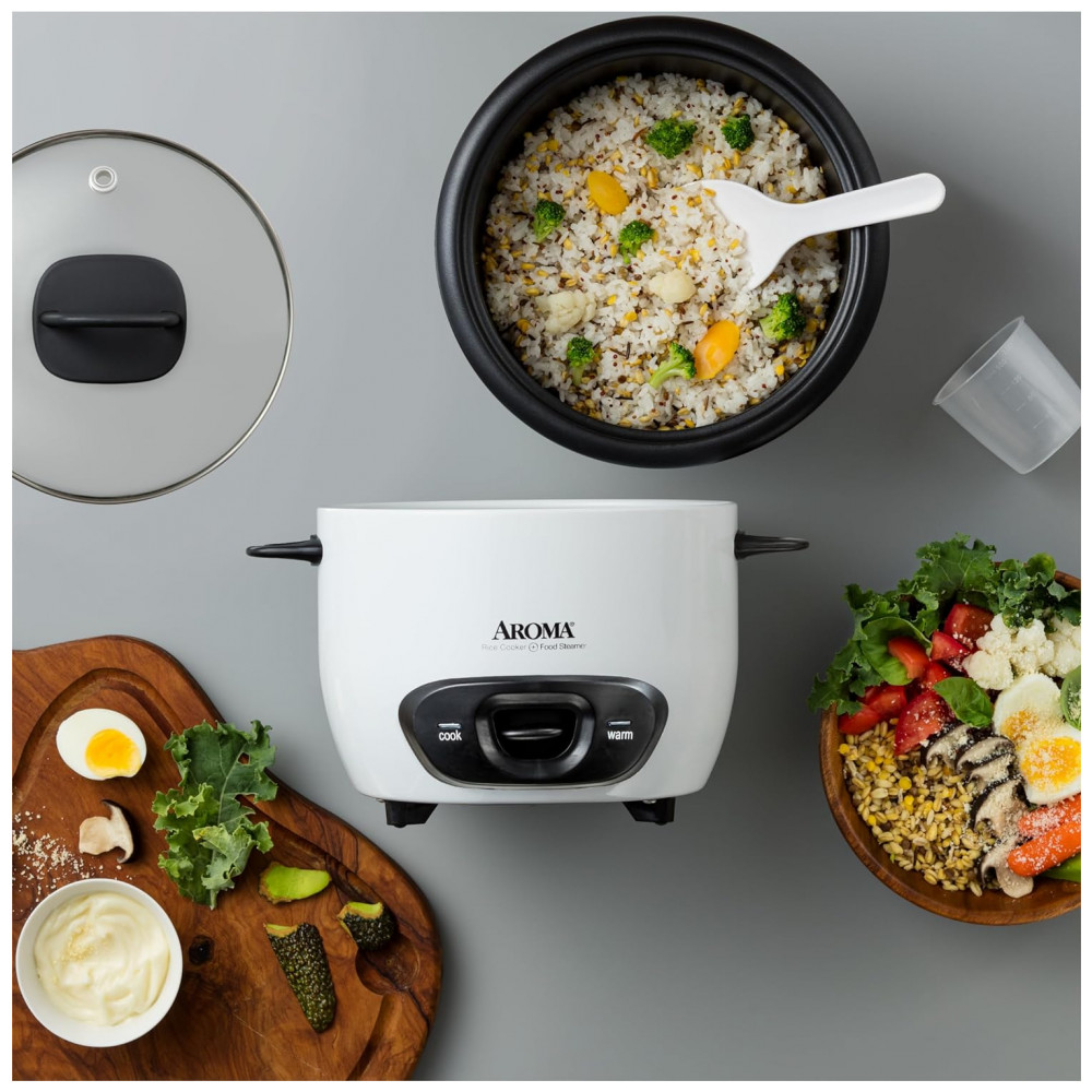 Panela de Arroz Elétrica 720 mL, AROMA HOUSEWARES ARC 743G, Branco: Operação simples despeje em até 3 xícaras de arroz cru, adicione água e empurre a alavanca para baixo para iniciar.