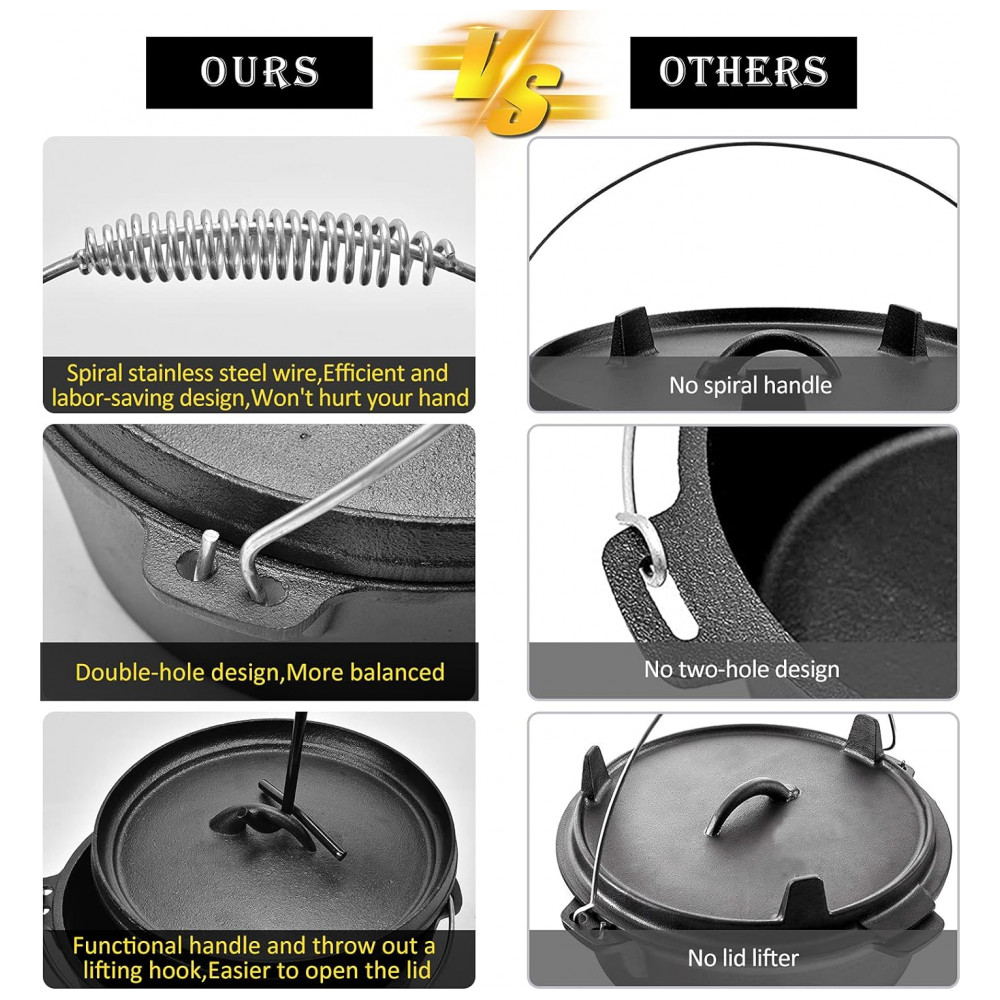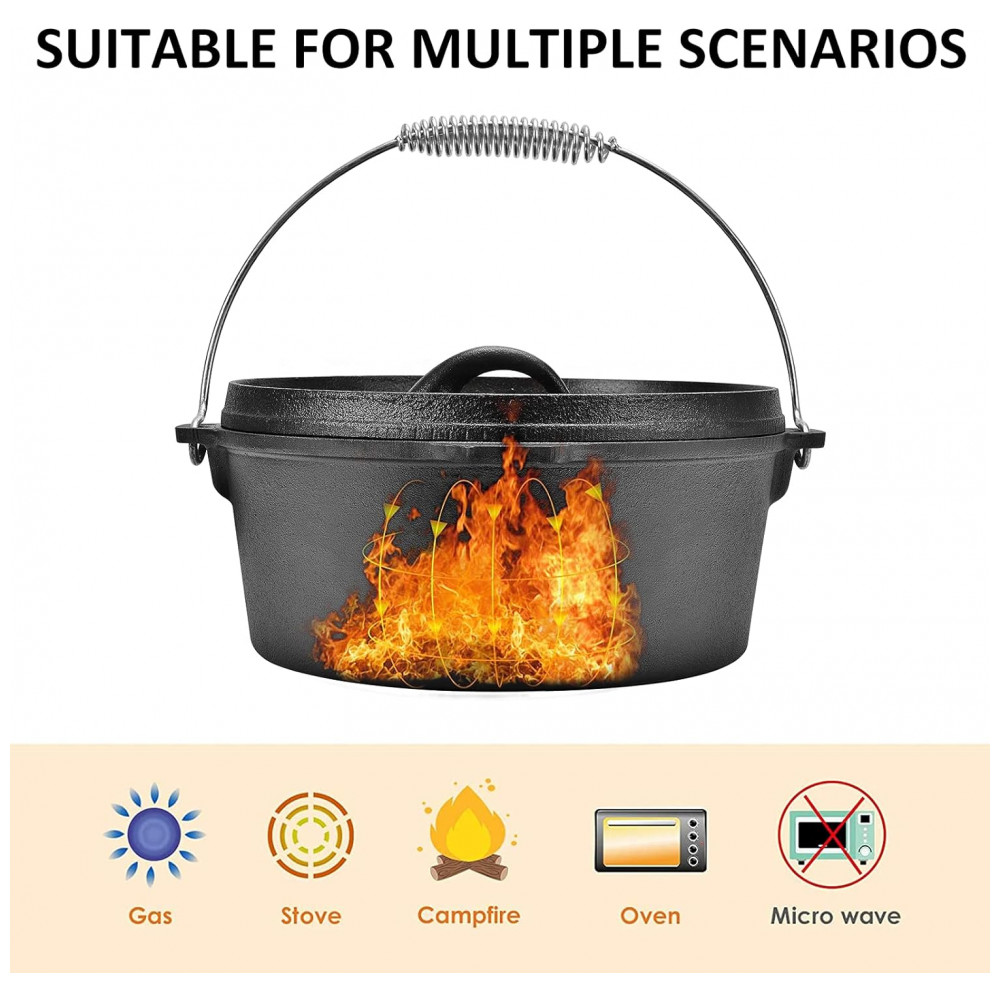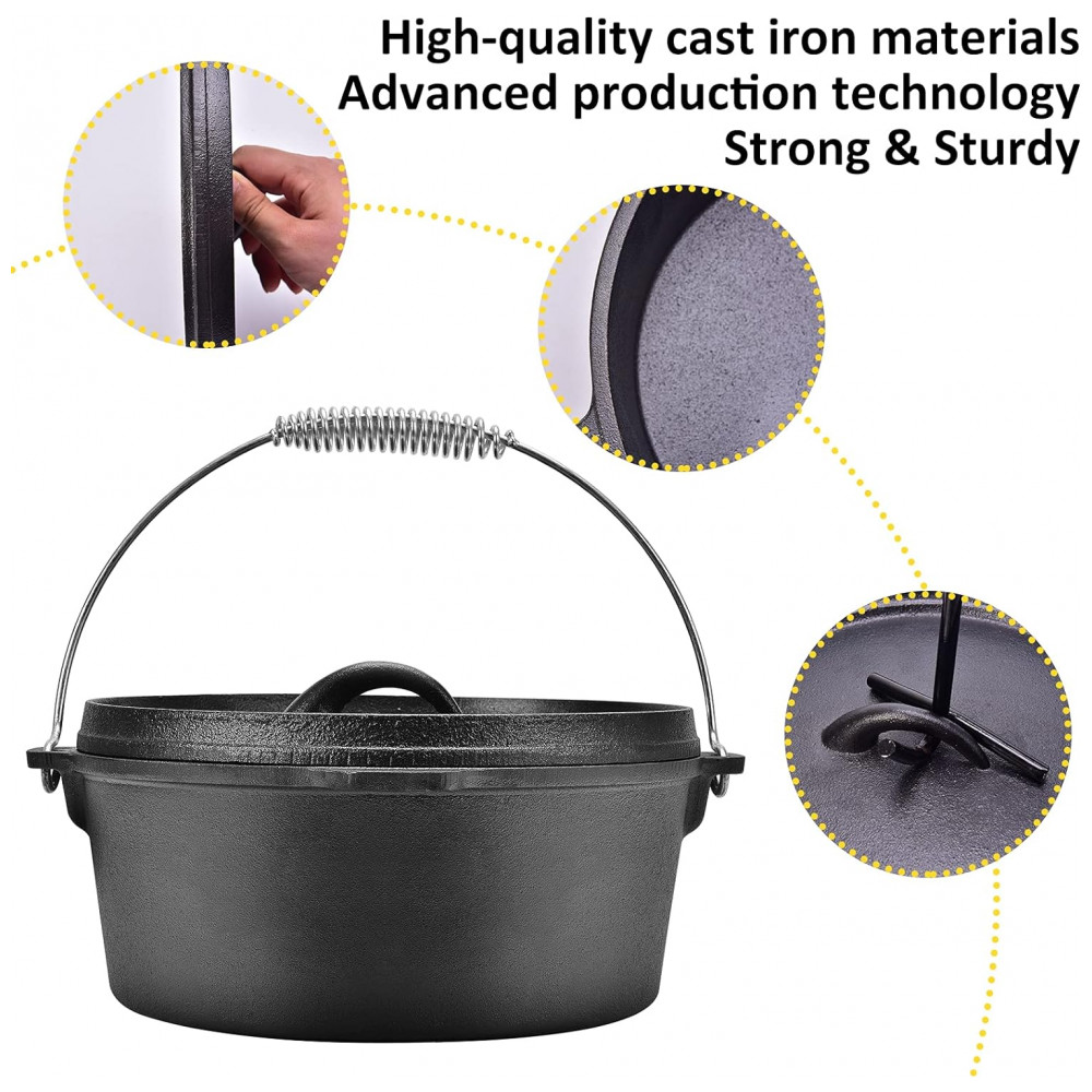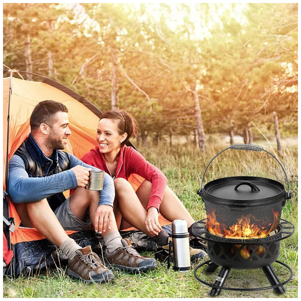 Projeto multifuncional A panela de ferro fundido com tampa é projetada para conter carvão quente, o que permitirá que você aplique calor aos seus alimentos de todas as direções.