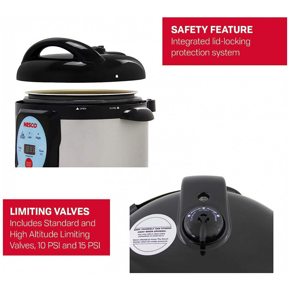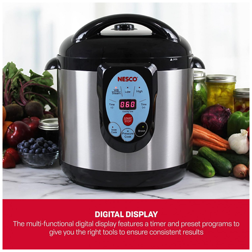 Panela de Pressão Multifuncional 9,5L, Painel Digital, Aço Inoxidável, 1200W, 110V, NESCO NPC 9, Preto: Conheça a Panela de Pressão Elétrica Inteligente NESCO NPC 9 Versatilidade e Segurança para sua Cozinha MULTIFUNCIONAL Projetada para enlatamento sob pressão, cozimento sob pressão, cozimento a vapor e cozimento lento.