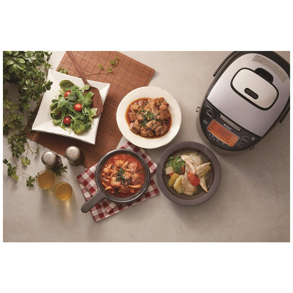 Panela Elétrica de Arroz, 1,3 L, 400W, preto e prata, 110v, TIGER CORPORATION JKT D10U, Preto: A tecnologia avançada de aquecimento por indução cozinha de uma corrente elétrica alternada em torno de toda a panela interna revestida de cerâmica.
