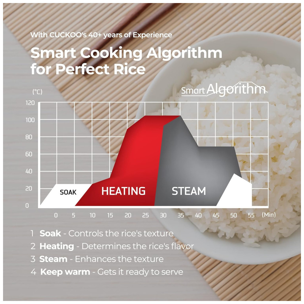 Junte se à comunidade Cuckoo e desfrute do seu arroz perfeitamente cozido, preparado em nenhum momento em sua máquina de fazer arroz elegante e moderna que complementará qualquer cozinha