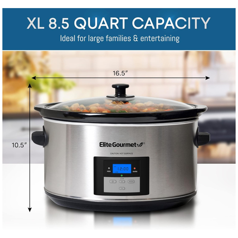 Panela Elétrica Digital 8L Programável com Temporizador Ajustável, Aço Inoxidável, 110V 280W, ELITE GOURMET MST 900D, Prateado: Apresentando a Panela de Cozimento Lento Digital Programável Elite Gourmet MST 900D, com 8 litros de capacidade, perfeita para alimentar toda a família com praticidade e sabor.