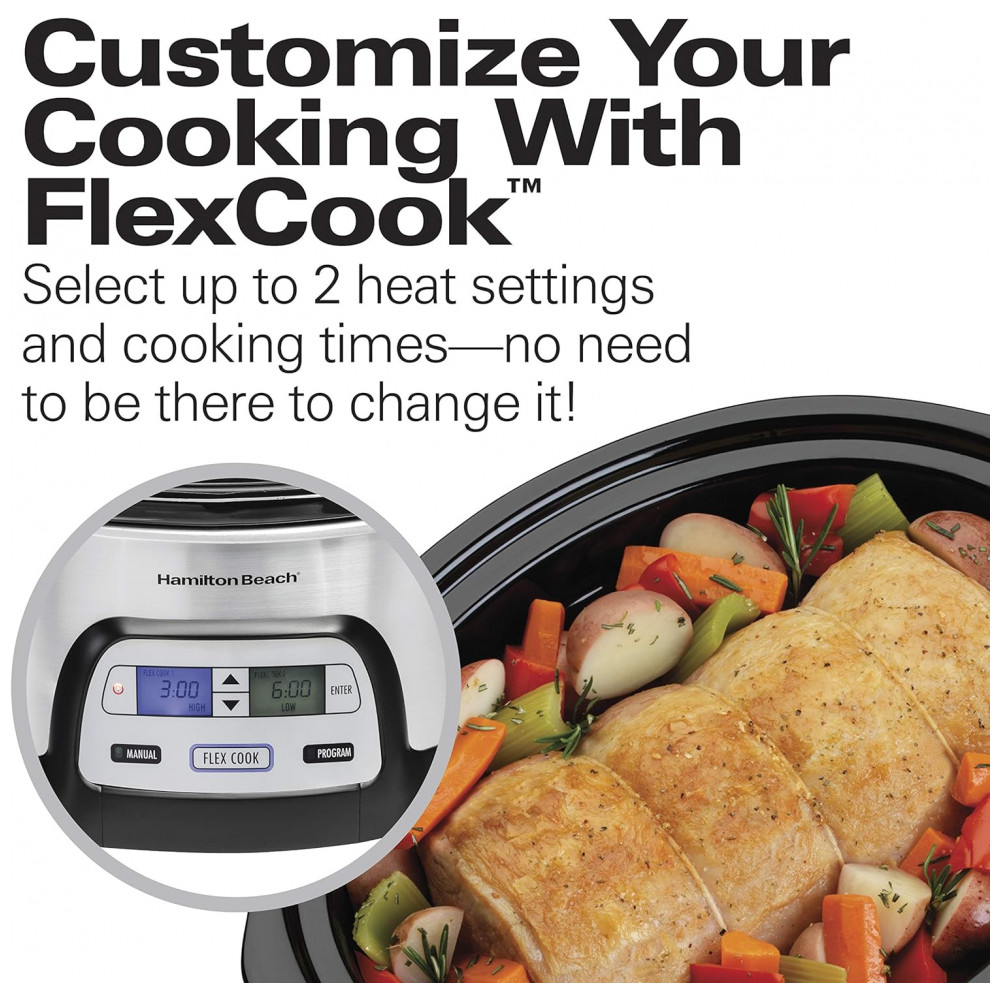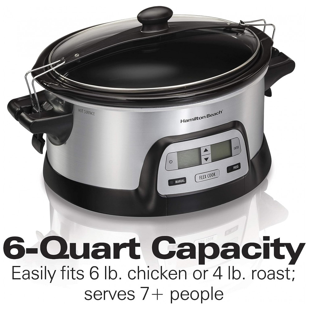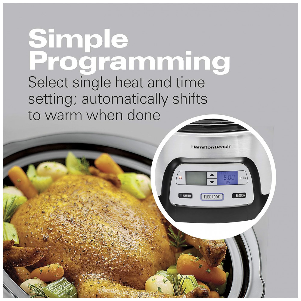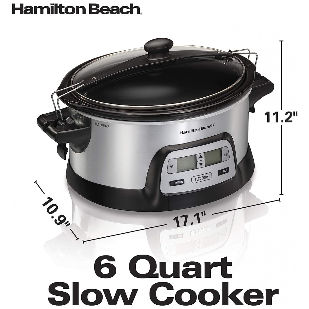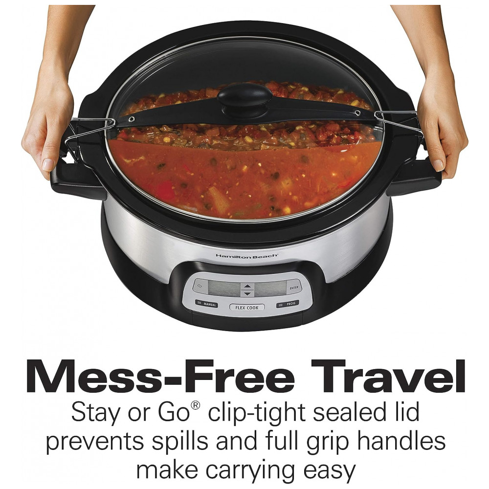 Apresentando a Panela de Cozimento Lento Programável Hamilton Beach 33861 com capacidade de 5,7 litros, ideal para preparar refeições para toda a família e perfeita para transportar sem bagunça.