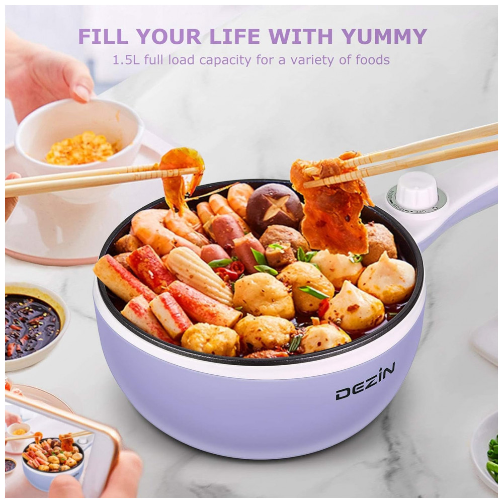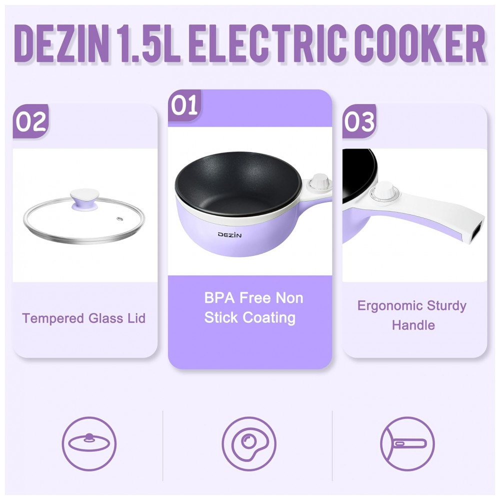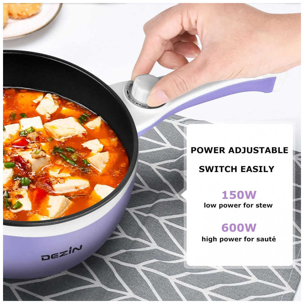 Panela Elétrica Multifuncional 1,5L, Aço Inoxidável, com Controle de Temperatura, 600W, 110V, DEZIN DZ150, Lilás: Conheça a Panela Elétrica Dezin Atualizada Praticidade e Sabor em Qualquer Lugar Cozinhe e Salteie sem Fogão a Qualquer Hora Além das funções tradicionais de cozimento, esta panela elétrica também pode ser utilizada para saltear alimentos, graças ao revestimento antiaderente de qualidade alimentar.