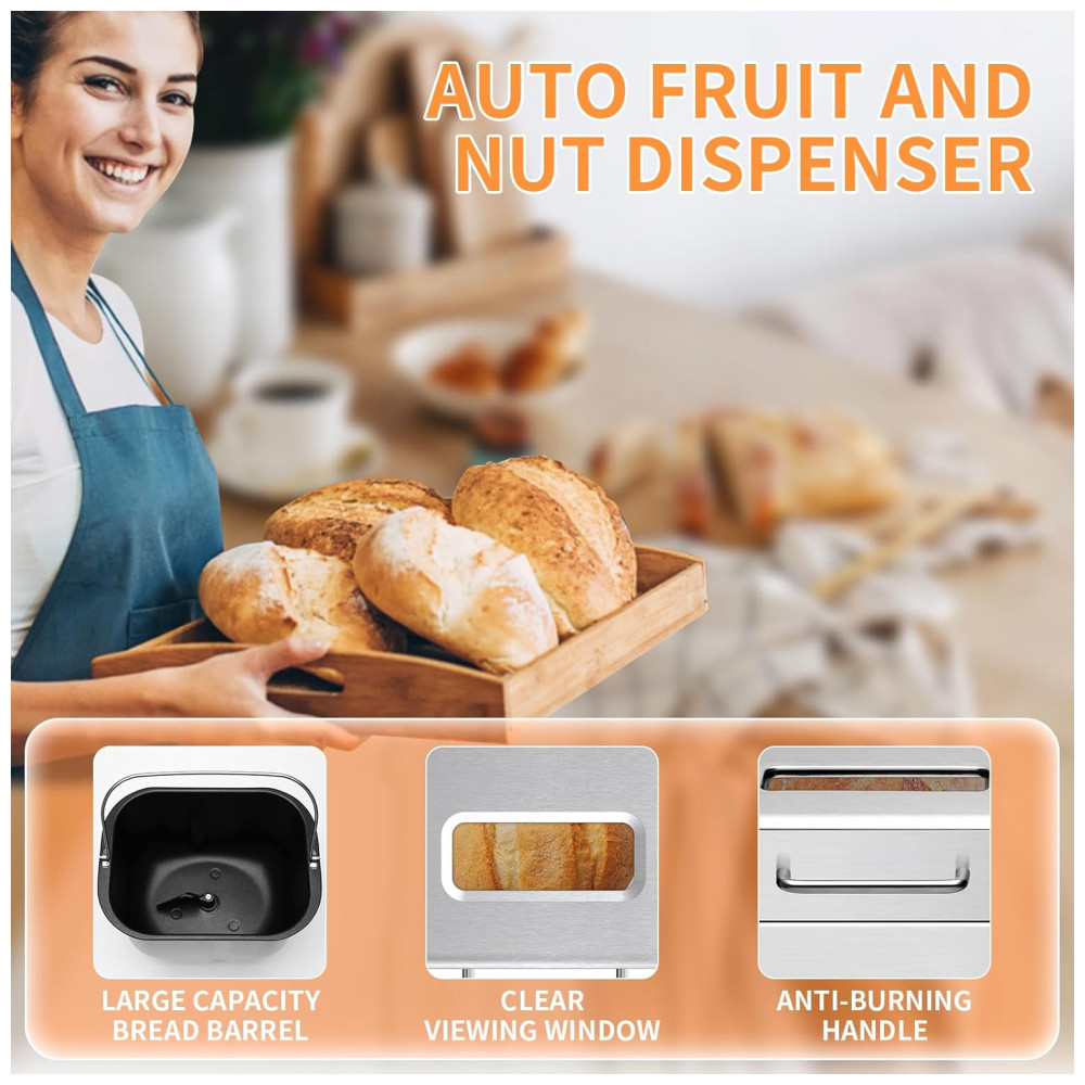 Panificadora em Aço Inoxidável com 16 Funções, Panela de Cerâmica Antiaderente e Dispenser de Frutas, SEEDEEM, Prata