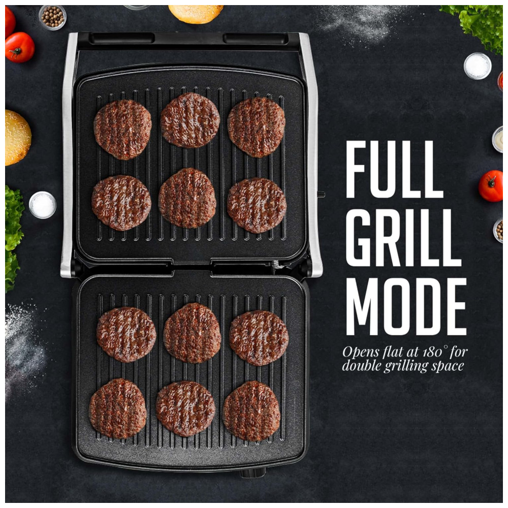 Ele abre em 180 para dobrar o espaço para grelhar e possui uma alça de toque frio para um manuseio e confortável.