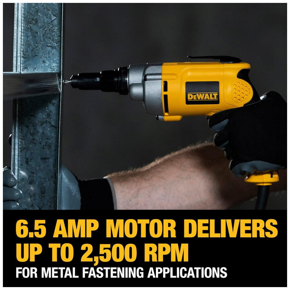 Parafusadeira 6. com Controle de Torque e Velocidade Variável e Reversível, 110v, DEWALT DW268, Amarelo: Aço de corte helicoidal e engrenagens tratadas termicamente para longa vida útil e durabilidade da parafusadeira A parafusadeira DEWALT possui motor de alta potência para aplicações de fixação de metal O sistema de ajuste de torque Versa Clutch da pistola de parafuso de drywall mostra o torque adequado necessário para acionar os fixadores com eficiência sem descascar ou quebrar Gatilho de dois dedos para maior conforto e facilidade de uso Nariz de metal e caixa de engrenagens para maior durabilidade no trabalho Excelente ergonomia oferece menos fadiga ao usuário Aço de corte helicoidal, engrenagens de aço tratadas termicamente para longa vida útil e durabilidade Motor de alta potência para aplicações de fixação de metal O sistema de ajuste de torque da embreagem Versa mostra o torque adequado necessário Punho de borracha e gatilho de dois dedos para maior conforto e maior controle Nariz de metal e caixa de engrenagens para maior durabilidade no trabalho, excelente ergonomia oferece menos fadiga ao usuário