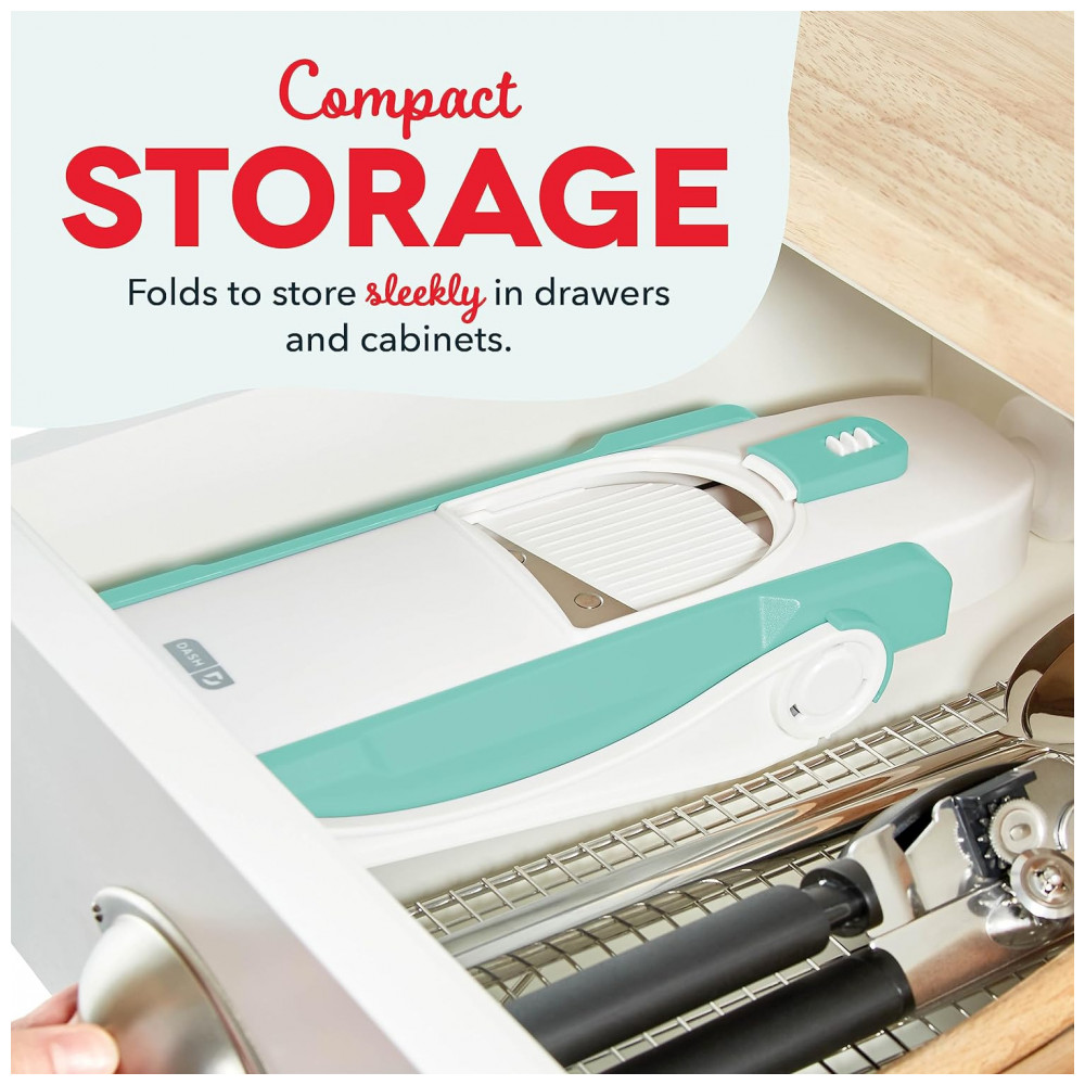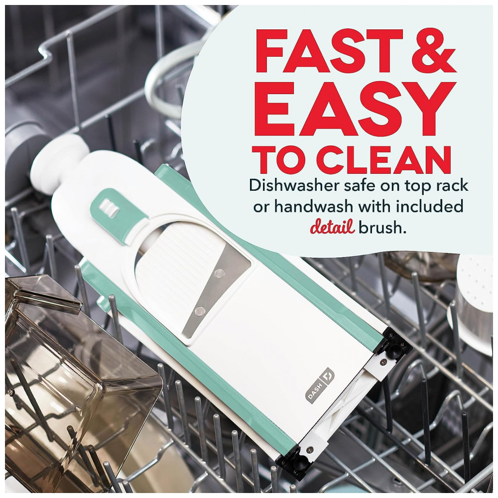 Picador de Legumes e Vegetais Ajustável 30 Predefinições, DASH DSM100, Azul turquesa: MAIS Projetado para manter as mãos e os dedos longe das lâminas, para uma maneira mais fácil e segura de fatiar.