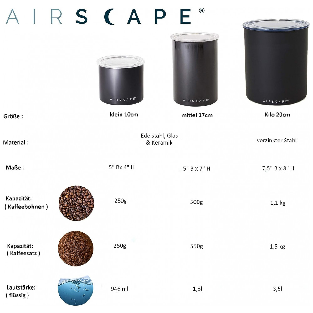 Pote Hermético para Café 1.3 kg em Aço Inoxidável, AIRSCAPE 645771002619, Preto: ZENAMENTO EXTRA GRANDE O Kilo, o maior de nossos recipientes Airscape, zena até 2,5 libras 1,1 kg de grãos de café Este recipiente gigante é projetado para itens de alimentos de maior volume e zenamento ideal de bancada e despensa DESIGN INOVADOR E PATENTEADO O recipiente Airscape para zenamento de café e alimentos apresenta a tampa patenteada do êmbolo com uma válvula de duas vias que empurra para fora e mantém o excesso de ar e umidade para preservar e proteger o frescor e o sabor de seus produtos zenados secos.