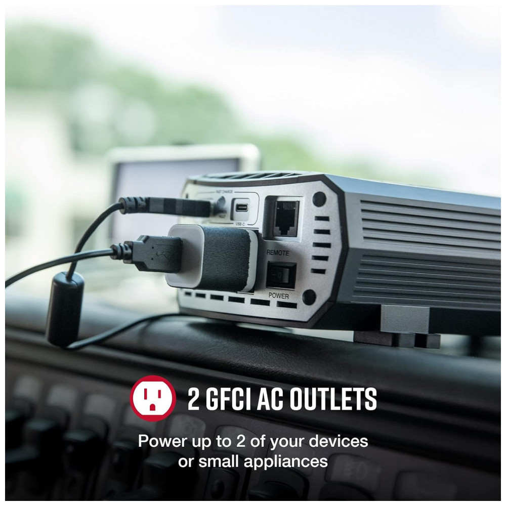 2 SAÍDAS CA PROTEGIDAS GFCI Ligue facilmente até 2 de seus dispositivos médicos, dispositivos de entretenimento, eletrônicos ou pequenos aparelhos com tomadas CA protegidas GFCI para cada um.