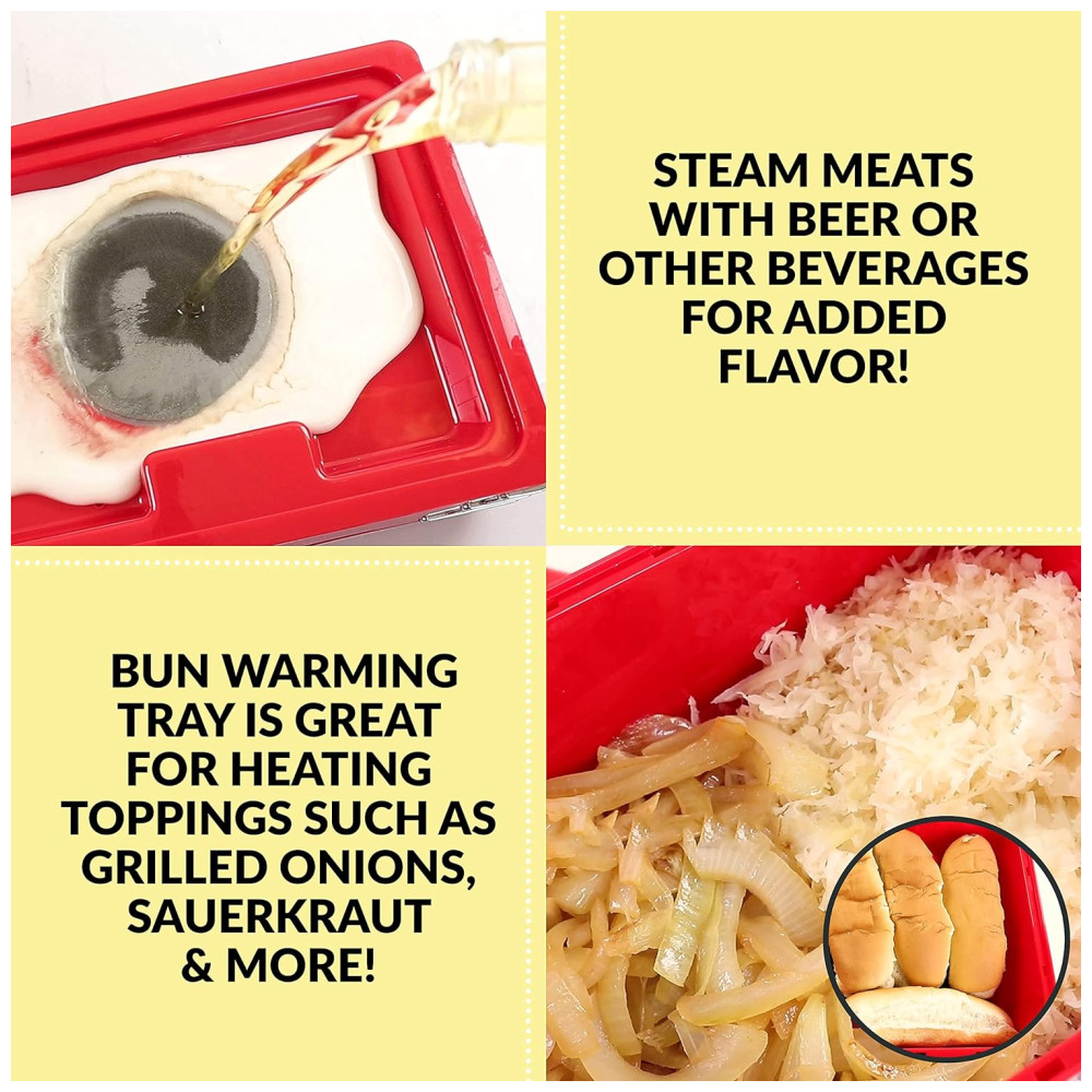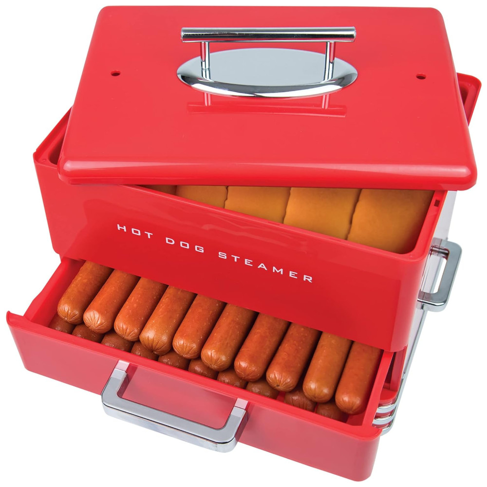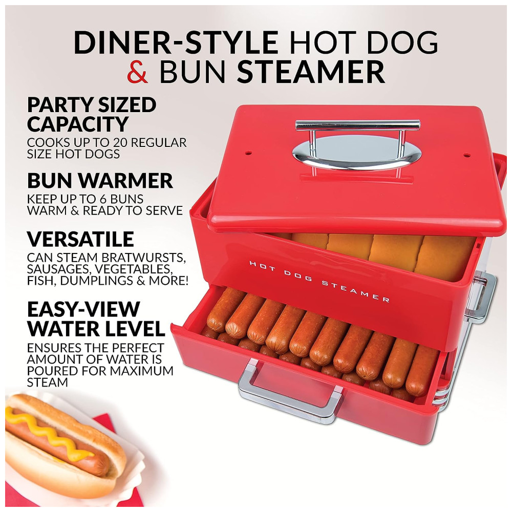 Preparador de Cachorro Quente 2 em 1 Vaporizador Capacidade até 24 Hot Dogs, NOSTALGIA HDS248RD, Vermelho: Grande estilo e ótimo sabor o vaporizador de cachorro quente no estilo lanchonete cozinha até 24 cachorros quentes por vez e pode cozinhar salsichas, salsichas, legumes, peixes, bolinhos de café da manhã e muito mais Bandeja de aquecimento de pães o aquecedor de pães comporta até 12 pães por vez, mantendo os aquecidos e prontos para serem saboreados Fácil de usar o botão de cozimento de 3 posições alto, quente e desligado facilita o cozimento basta adicionar água, colocar a tampa e girar para alto e os cachorros quentes cozidos no vapor estarão prontos em 15 20 minutos Janela do nível da água a janela do nível da água de fácil visualização garante que a quantidade certa de água seja derramada.