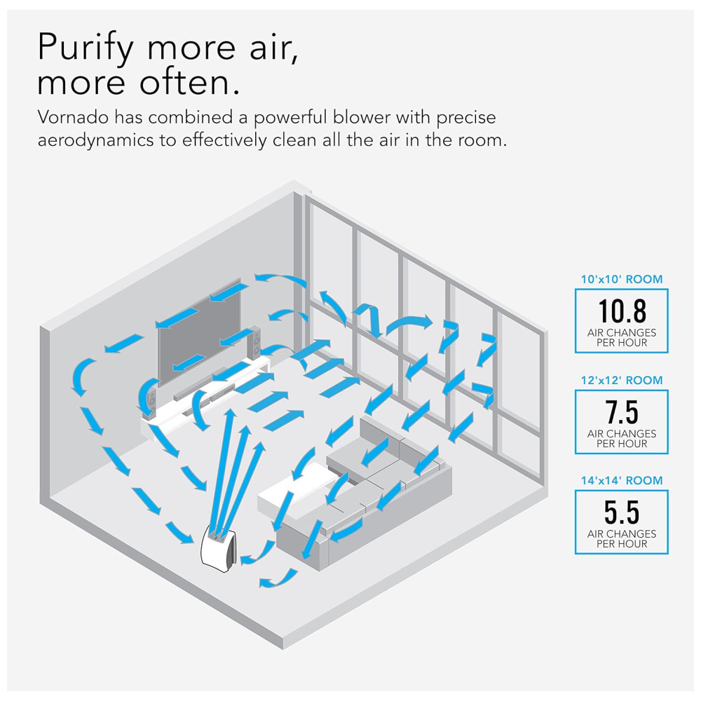 COBERTURA EFICIENTE O purificador de ar Vornado cobre com eficiência pequenas e médias salas, como um quarto, escritório ou cozinha até 220 pés quadrados.