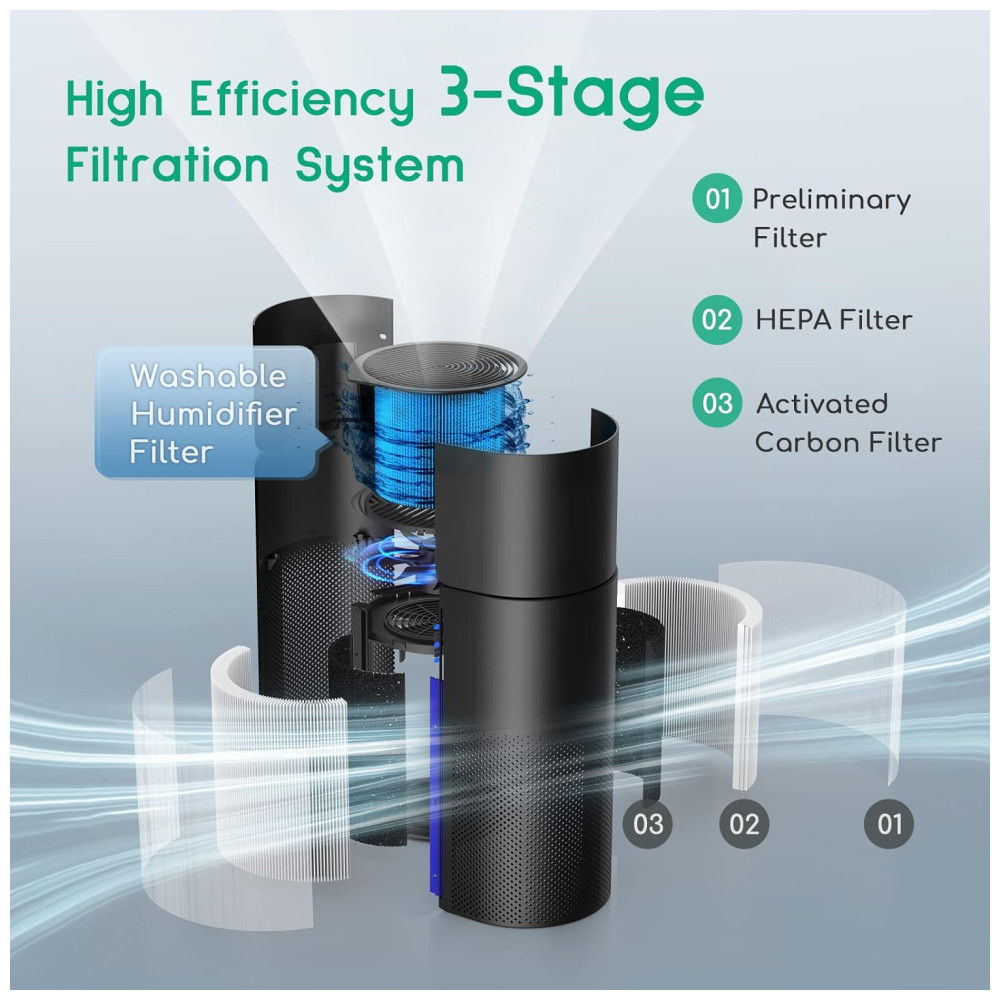 Nota o módulo umidificador não pode ser de forma independente Filtragem HEPA 3 em 1 O purificador de ar tem um sistema de filtragem de 3 estágios pré filtro, filtro de carvão ativado e filtro HEPA.