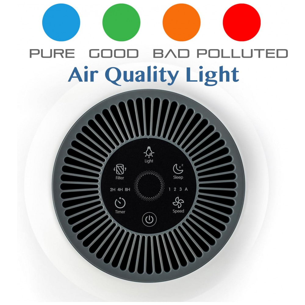 Alta tecnologiasensor de qualidade do ar embutido, executa e detecta a qualidade do ar circundante instantaneamente e 4 cores da luz AQ indica 4 níveis de qualidade do ar vermelho ar poluído laranja ar normal verde bom Ar Ar azul puro Você pode ver o quão rápido o purificador está purificando o ar na sala.