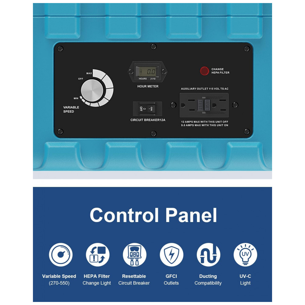 Possui uma entrada de ar maior do que qualquer unidade concorrente, luz de troca de filtros, display de horímetro, GFCI Duplex em cadeia, controle e regulador de velocidade variável.
