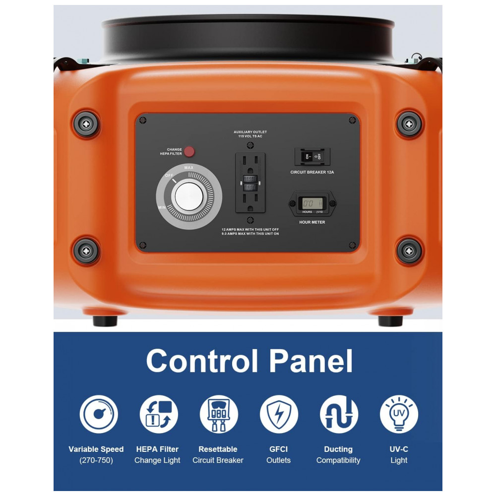 Além disso, este purificador de ar possui uma luz de troca de filtros, um display de horímetro, um GFCI Duplex em cadeia, empilhável e controle e regulador de velocidade variável, permitindo que você monitore facilmente as condições do ambiente de trabalho.