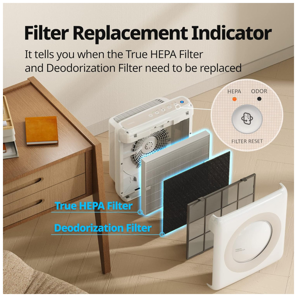 O indicador de substituição do filtro verifica o pré filtro e o filtro HEPA, respectivamente, para permitir que os usuários estejam cientes de quando lavar ou substituir o filtro.