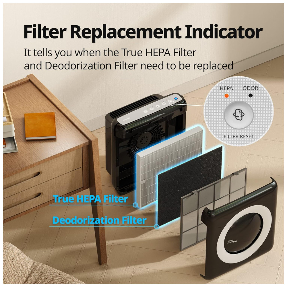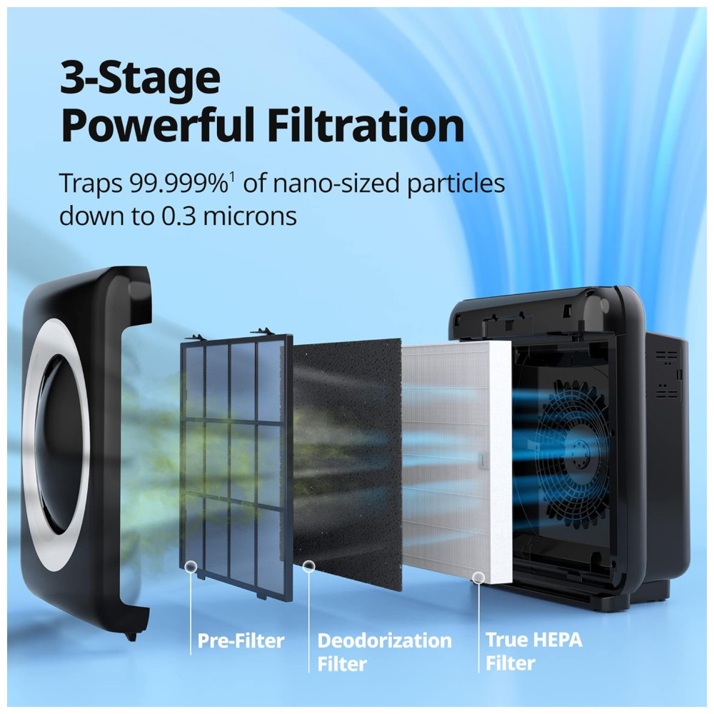 Equipado com uma RATING de eficiência HEPA de 99,97 por cento, ele usa um sistema de filtragem de quatro estágios para eliminar odores e poluentes com eficácia.