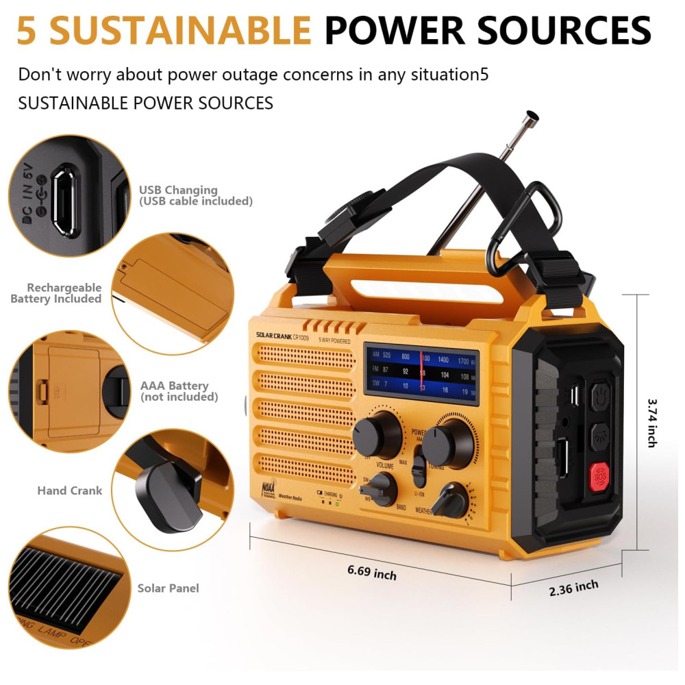 Rádio AM FM SW e NOAA 2000mAh Bateria Solar Manivela de Recarga Carregador USB, PPLEE CR1009, Amarelo
