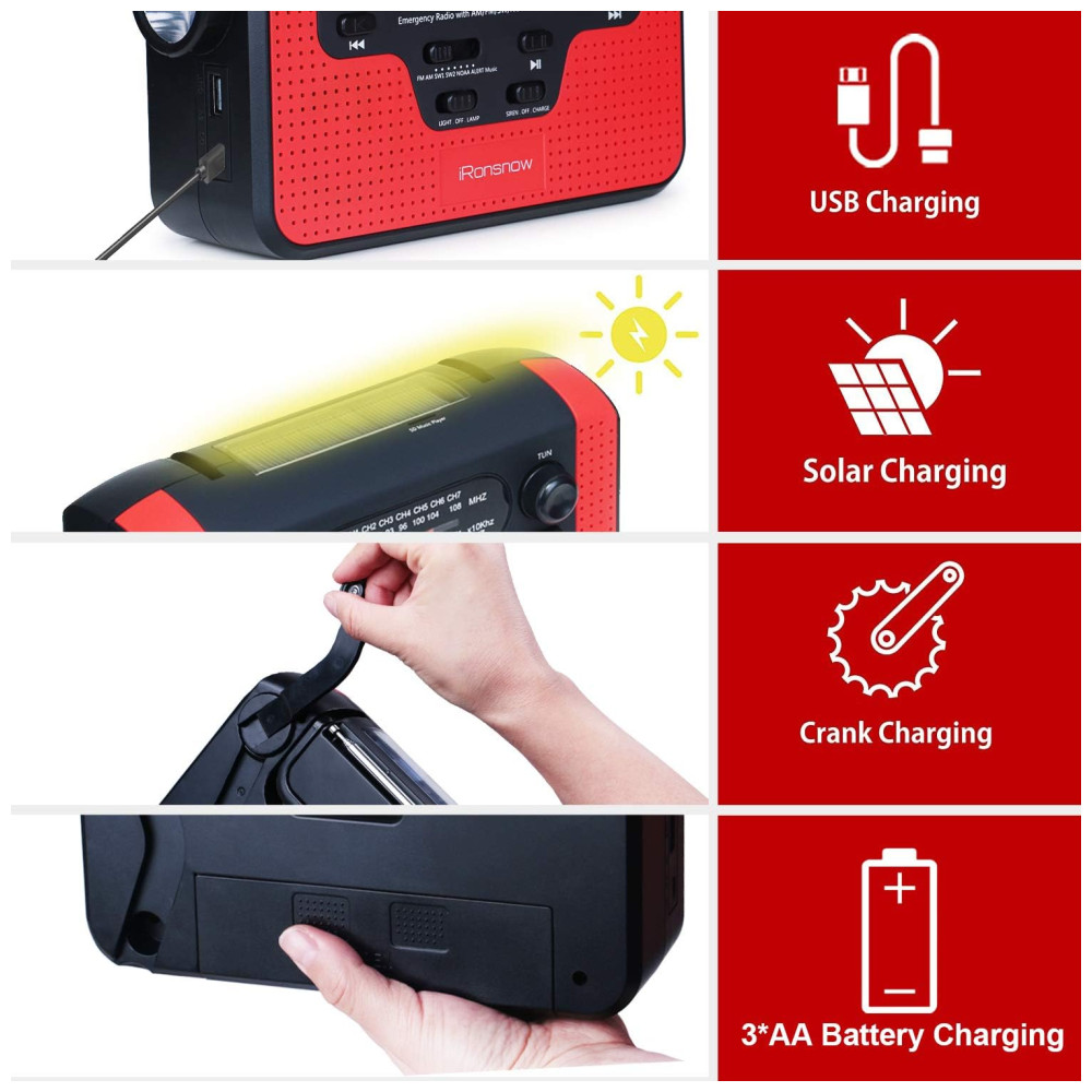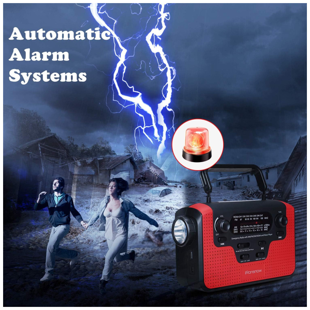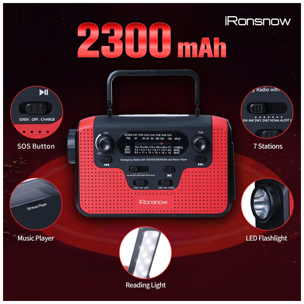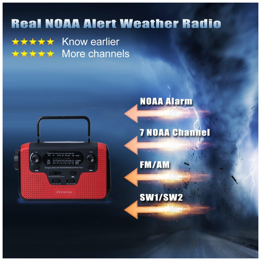 Rádio AM, FM, SW, WB, NOAA Manivela Solar Recarregável Sirene SOS MP3 Lanterna Carregador USB, IRONSNOW Radio IS388 Red, Vermelho: Real NOAA Alert Weather Radio Automaticamente ative o alarme para informá lo de quaisquer condições meteorológicas de desastre ou avisos, quando o rádio é definido no modo Alerta.