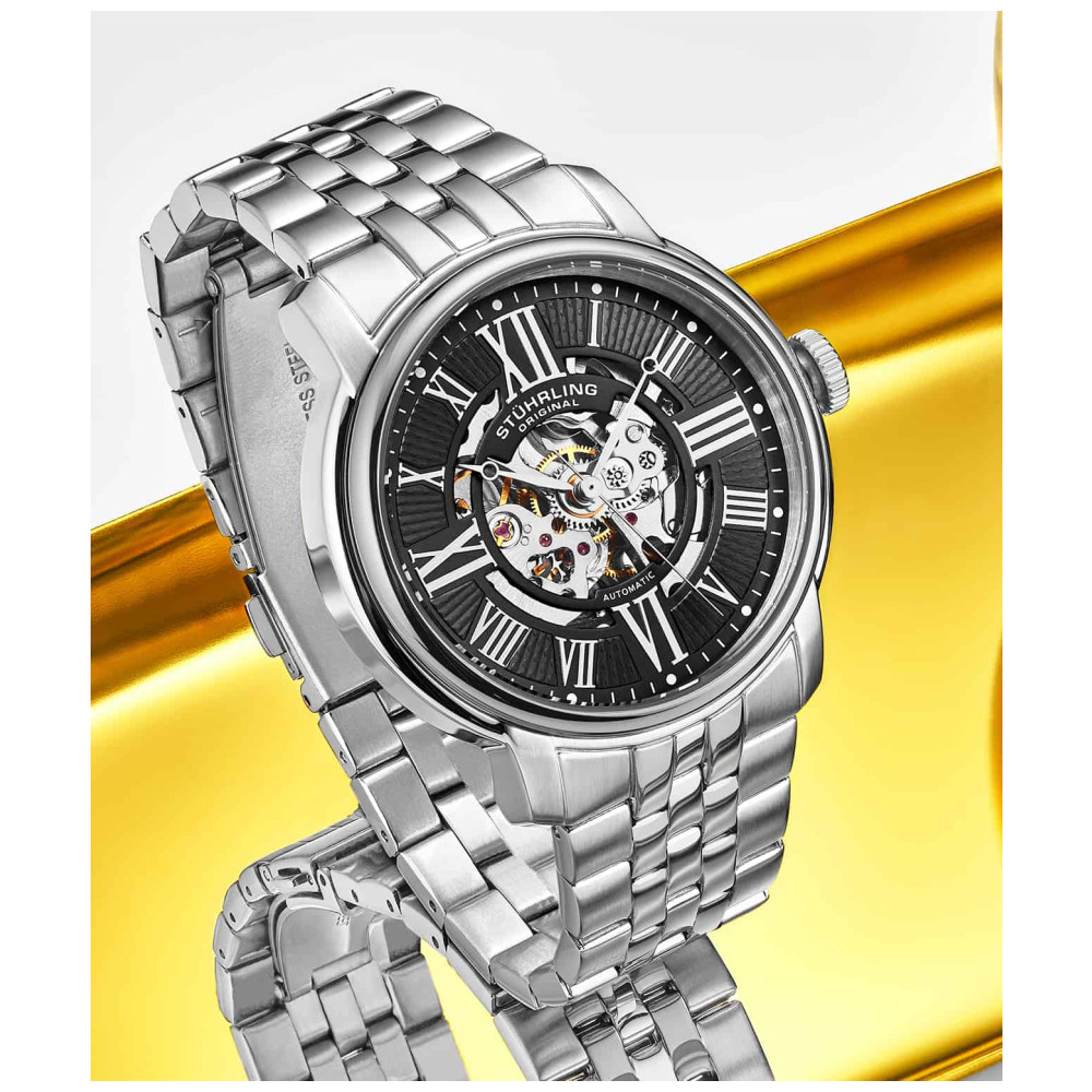 Relgio Automtico Atrium 4031 com Mostrador Preto de 42mm, Pulseira de Ao Inoxidvel Prateado e Fivela Dobrvel em Prata Stuhrling: .