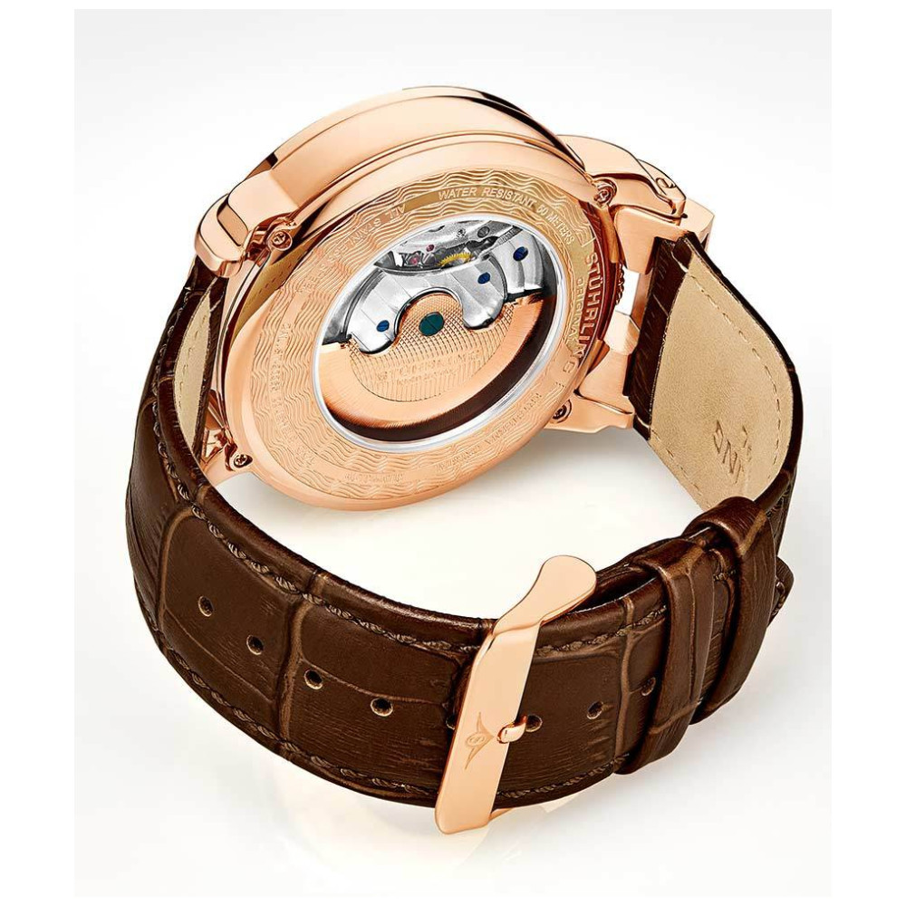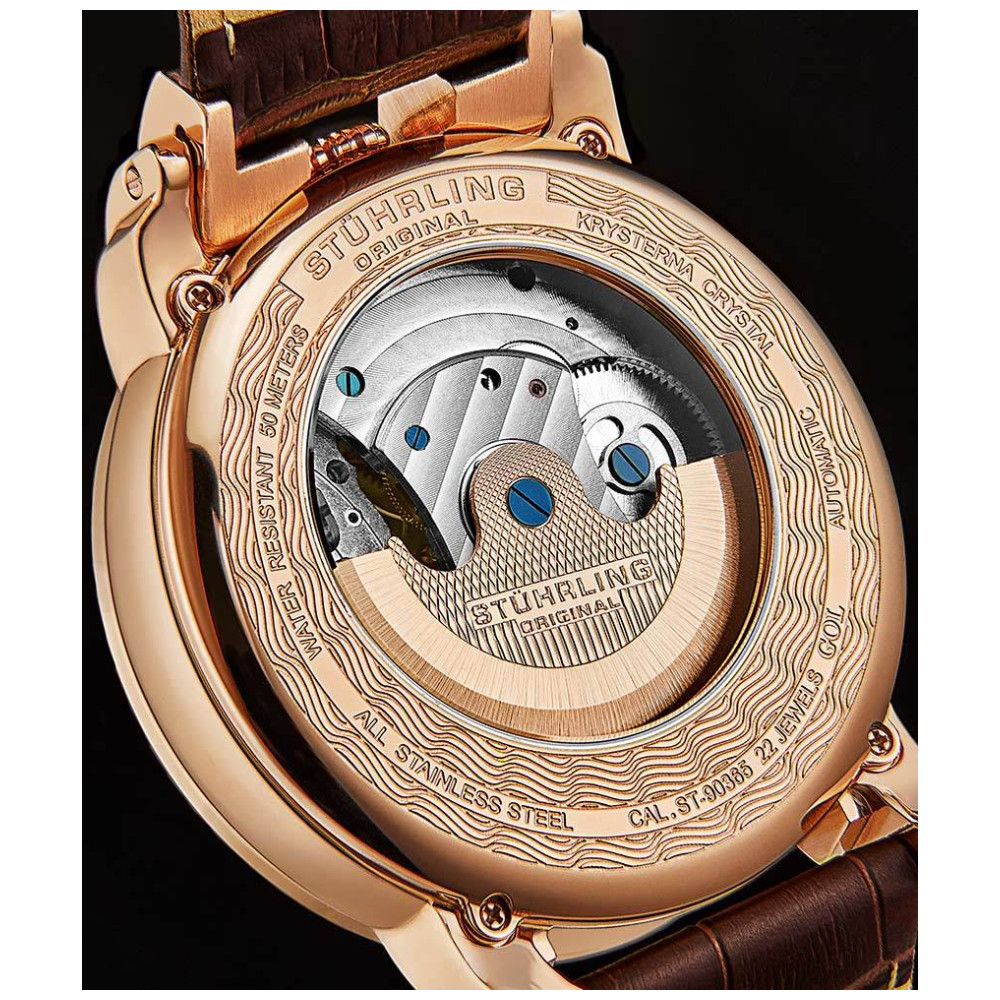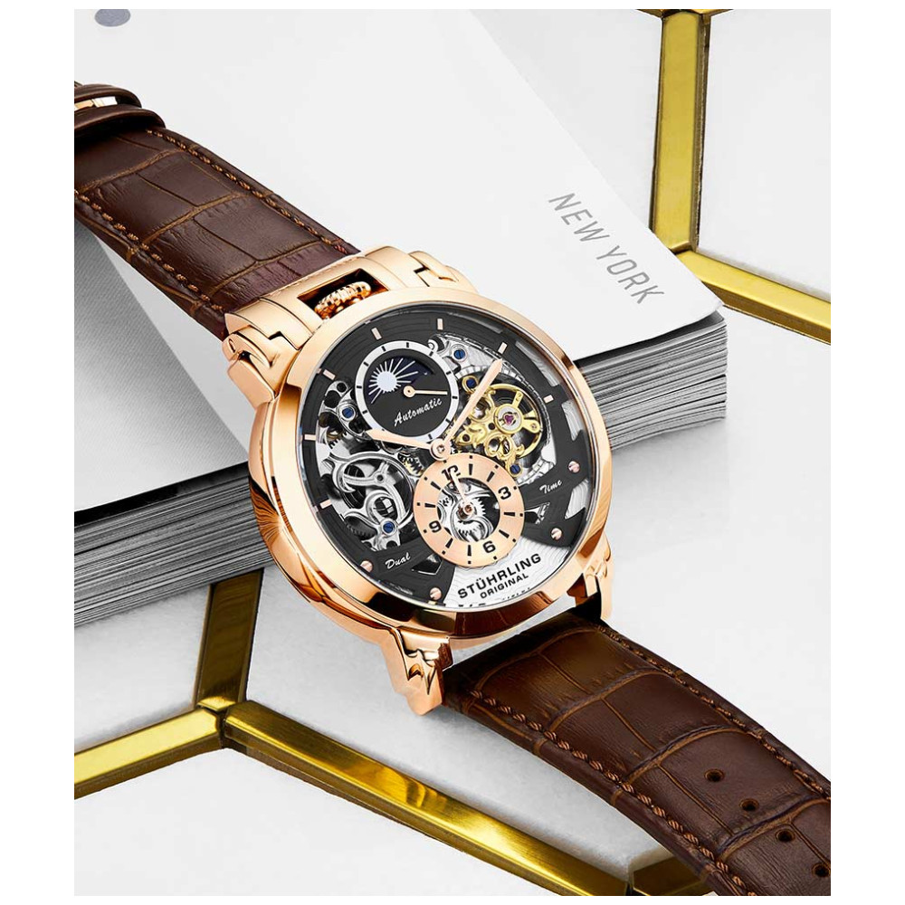 Relgio Automtico Menai 906 Mostrador Cinza Metlico e Pulseira de Couro Marrom com Fivela Tang em Camadas de Ouro Stuhrling: Alm disso, o relgio automtico Menai 906 apresenta um mostrador cinza metlico que adiciona uma elegncia discreta ao seu visual.