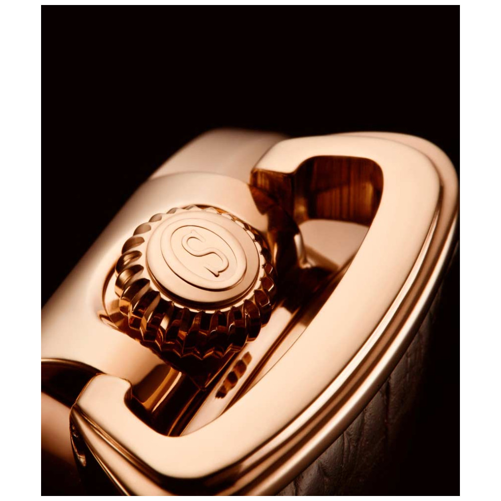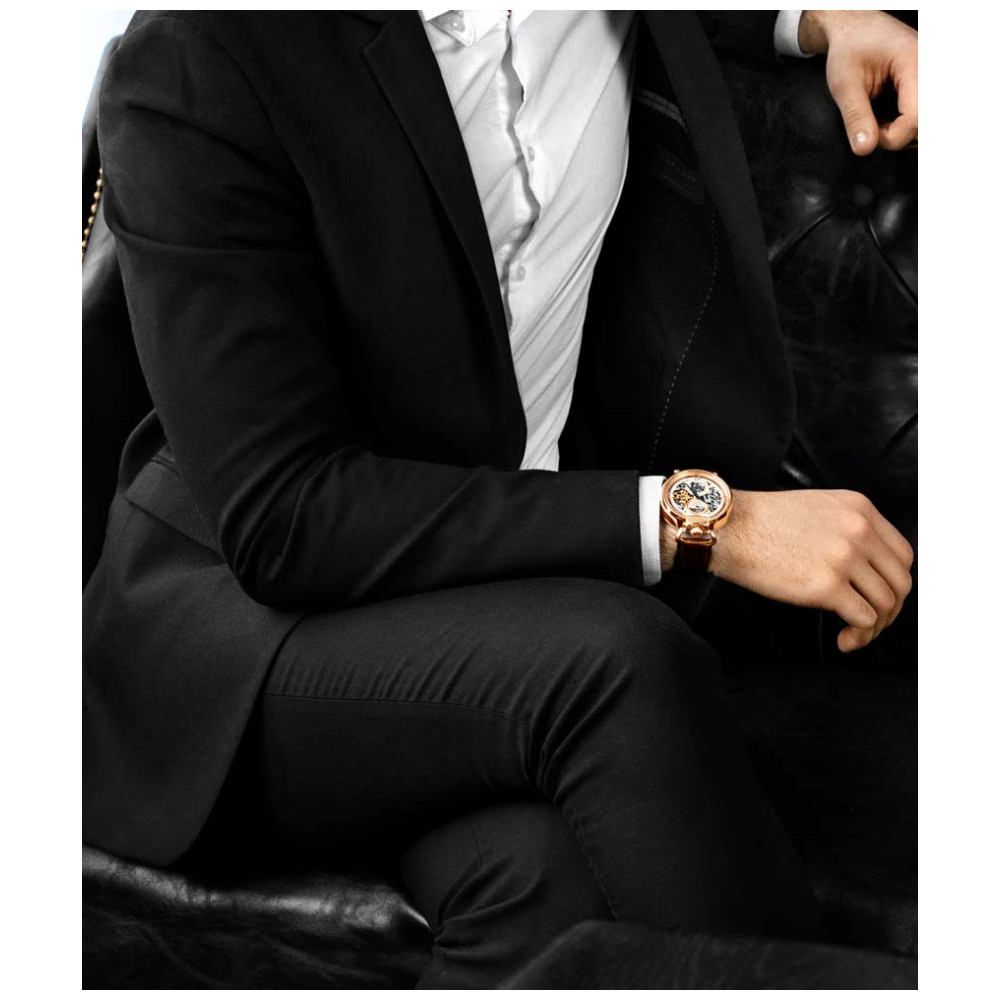 A pulseira de couro marrom com fivela de ouro adiciona um toque de sofisticao, enquanto a caixa de ao inoxidvel polido protege o movimento automtico totalmente dual time, garantindo uma preciso consistente e confivel.