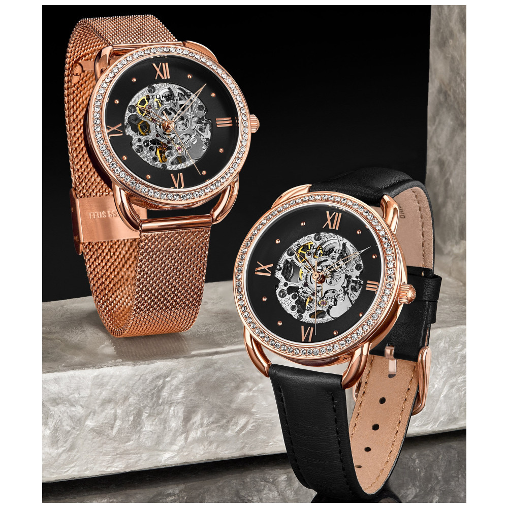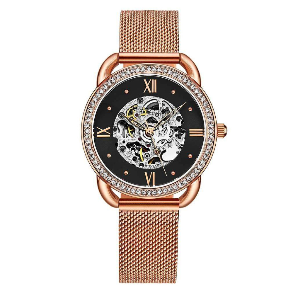 Relgio Automtico Stuhrling 3991M, Mostrador Preto e Rosa, Pulseira de Ao Inoxidvel com Fivela Dobrvel em Camadas de Ouro Rosa 36mm