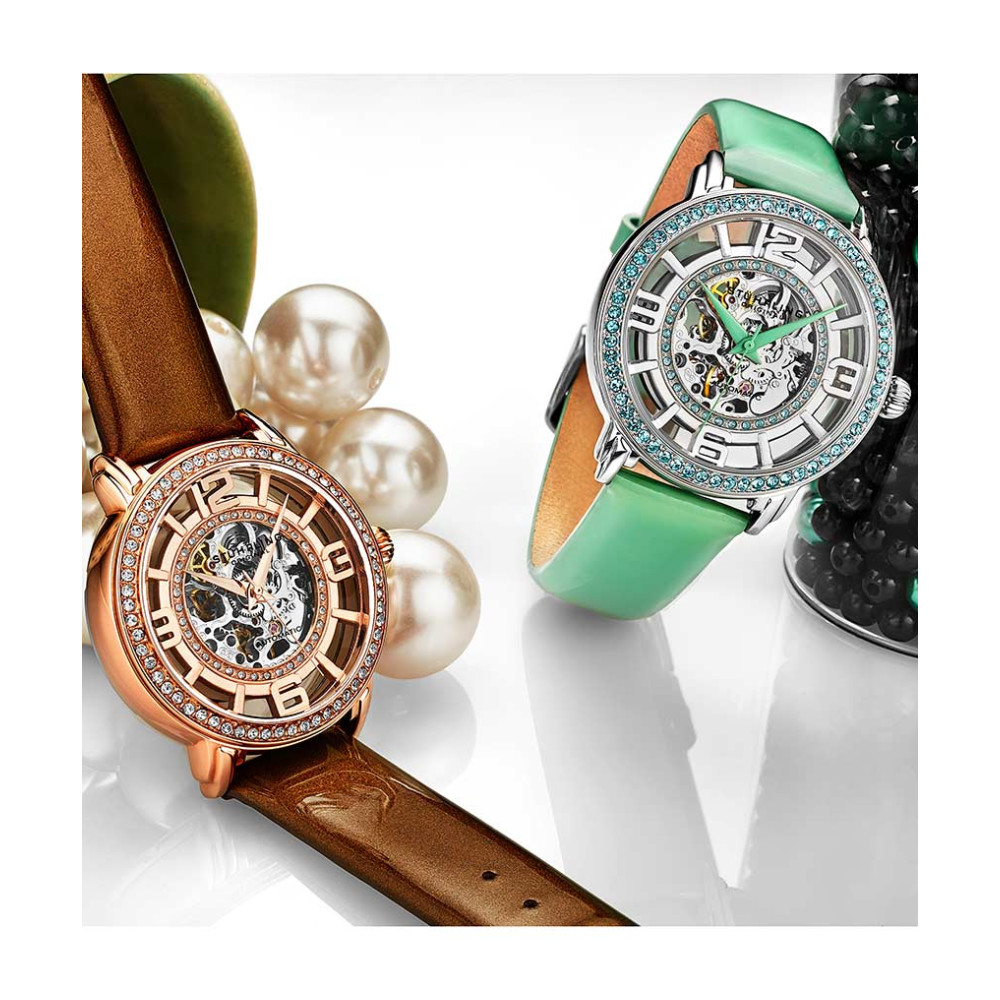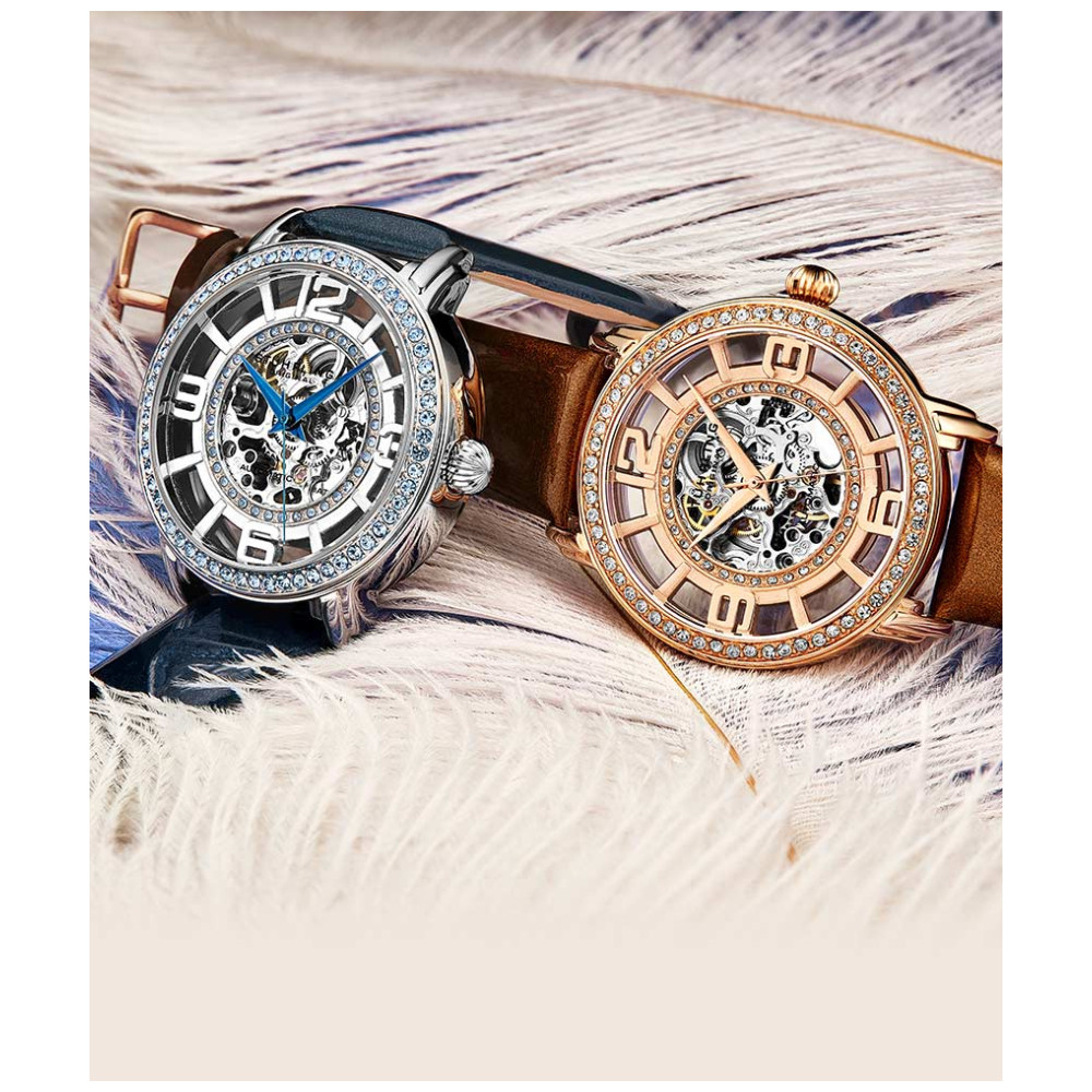 Com um tamanho de 38mm, seu mostrador externo esqueletizado adornado com cristais deslumbrantes, criando uma exibio impressionante do movimento exposto.