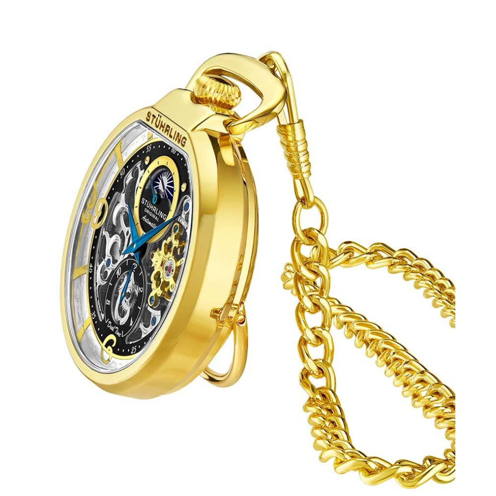 Relgio de Bolso Stuhrling Modena 991 Automtico 48mm Mostrador Preto com Detalhes em Ouro e Design em Ao Inoxidvel
