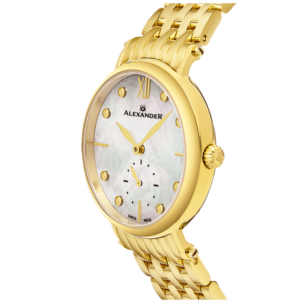 Com uma pulseira de ao inoxidvel em tom de ouro amarelo e um mostrador em madreprola branca, este relgio feminino de pequenos segundos um verdadeiro exemplo da excelncia sua em relojoaria.