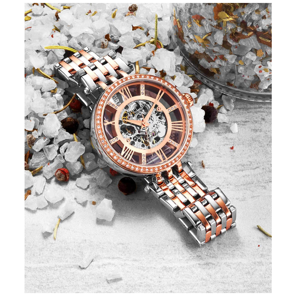 Relgio Delphi 3944 Automtico 38mm Mostrador Rosa e Prata Pulseira de Ao Inoxidvel Prateado com Fivela Implantvel Rosa Stuhrling: Alm disso, o mostrador rosa e prata adiciona um toque de elegncia, enquanto a fivela implantvel rosa proporciona um contraste sutil e sofisticado.