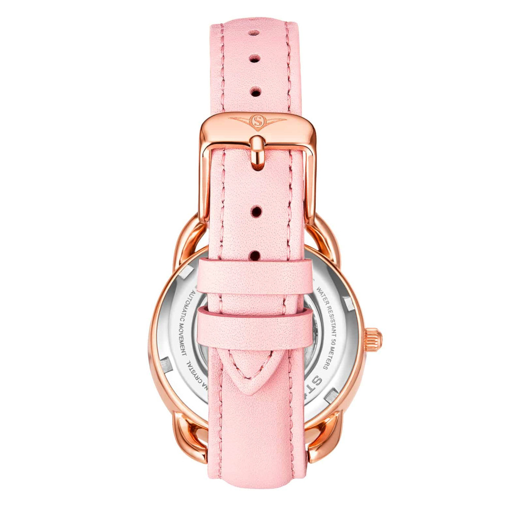 Relgio Feminino Stuhrling 3990 Automtico 36mm, Mostrador Rosa e Pulseira de Couro Rosa com Fivela Tang em Camadas de Ouro Rosa: O Relgio Feminino Stuhrling 3990 Automtico uma pea elegante e sofisticada que combina funcionalidade e estilo.
