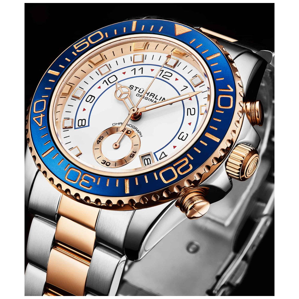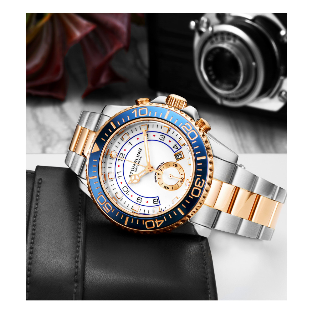 Relgio feminino Stuhrling Brigadeiro 3966 com moldura azul, mostrador branco e pulseira em ao rosa de dois tons.