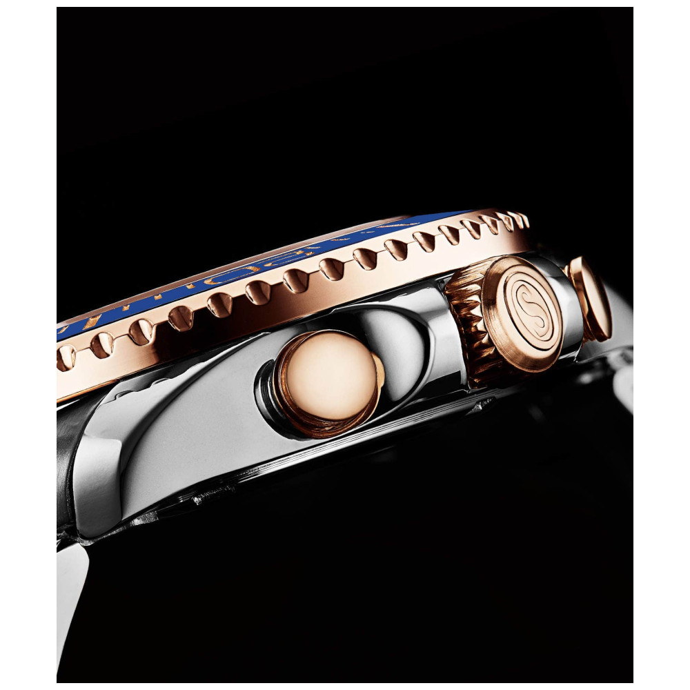 Com sua moldura azul, mostrador branco e pulseira em ao rosa de dois tons, este relgio um verdadeiro destaque em qualquer ocasio.