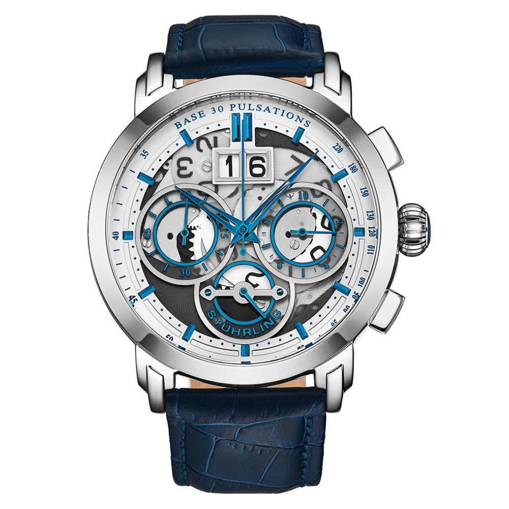 Relgio Imperia 4030 Crongrafo 47mm Mostrador Prateado e Pulseira de Couro Azul Stuhrling: O Relgio Imperia 4030 Crongrafo uma obra prima da relojoaria, com um mostrador prateado elegante e uma pulseira de couro azul luxuosa.
