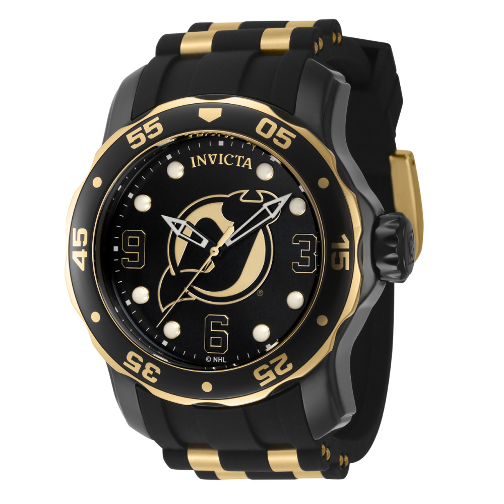 Relgio Invicta NHL New Jersey Devils 48mm, Ouro e Preto Modelo ZG 42310 para homens.: Este um relgio Invicta NHL com movimento preciso e caixa preta.