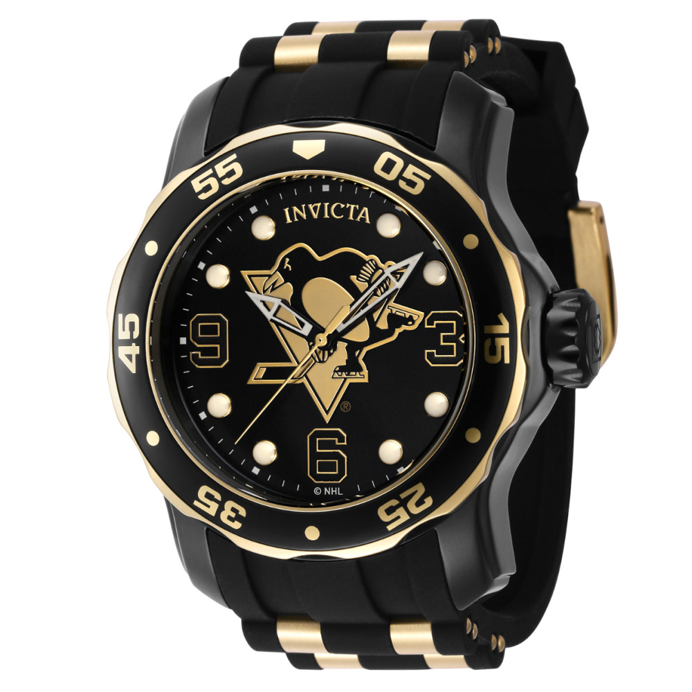 Relgio masculino Invicta NHL Pittsburgh Penguins 48mm, ouro e preto ZG 42322.: Este um relgio Invicta da coleo NHL, com movimento preciso e caixa preta.