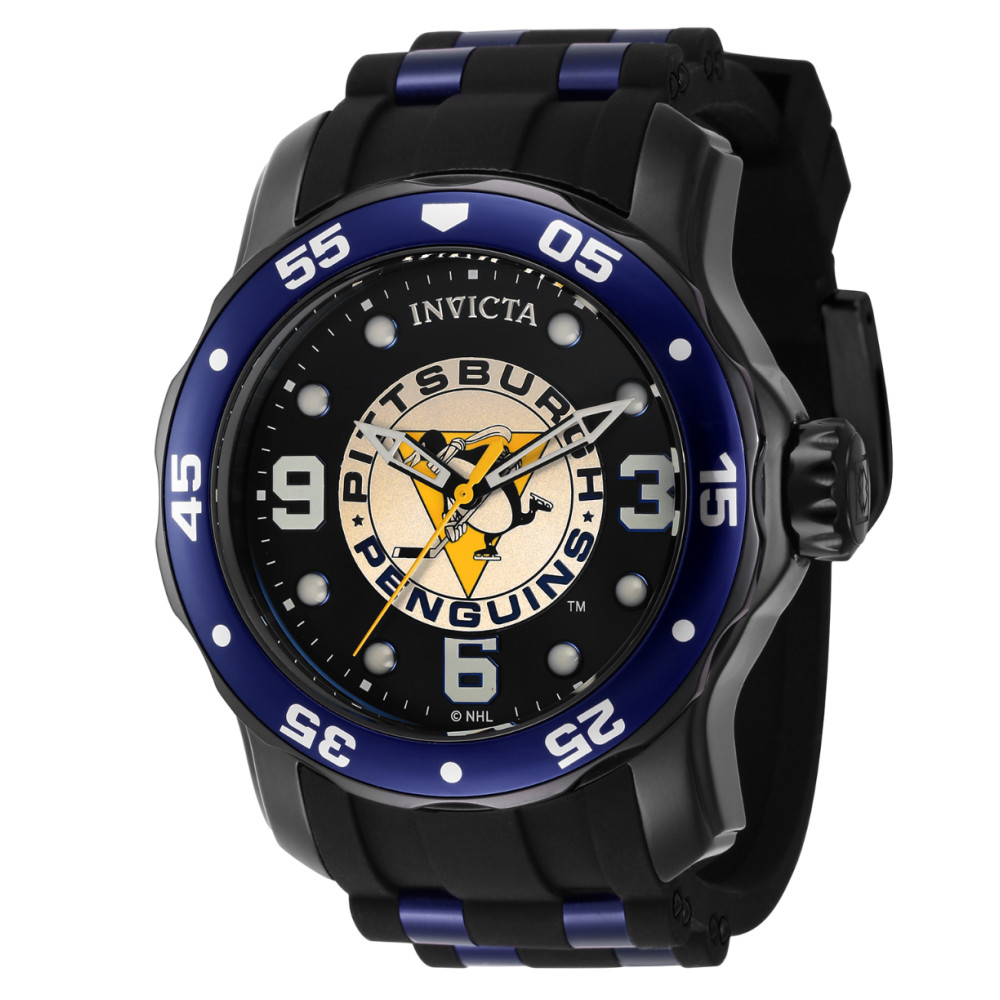 Relgio masculino Invicta NHL Pittsburgh Penguins 48mm, preto e azul.: Este um relgio Invicta da coleo NHL, com movimento preciso e caixa preta.