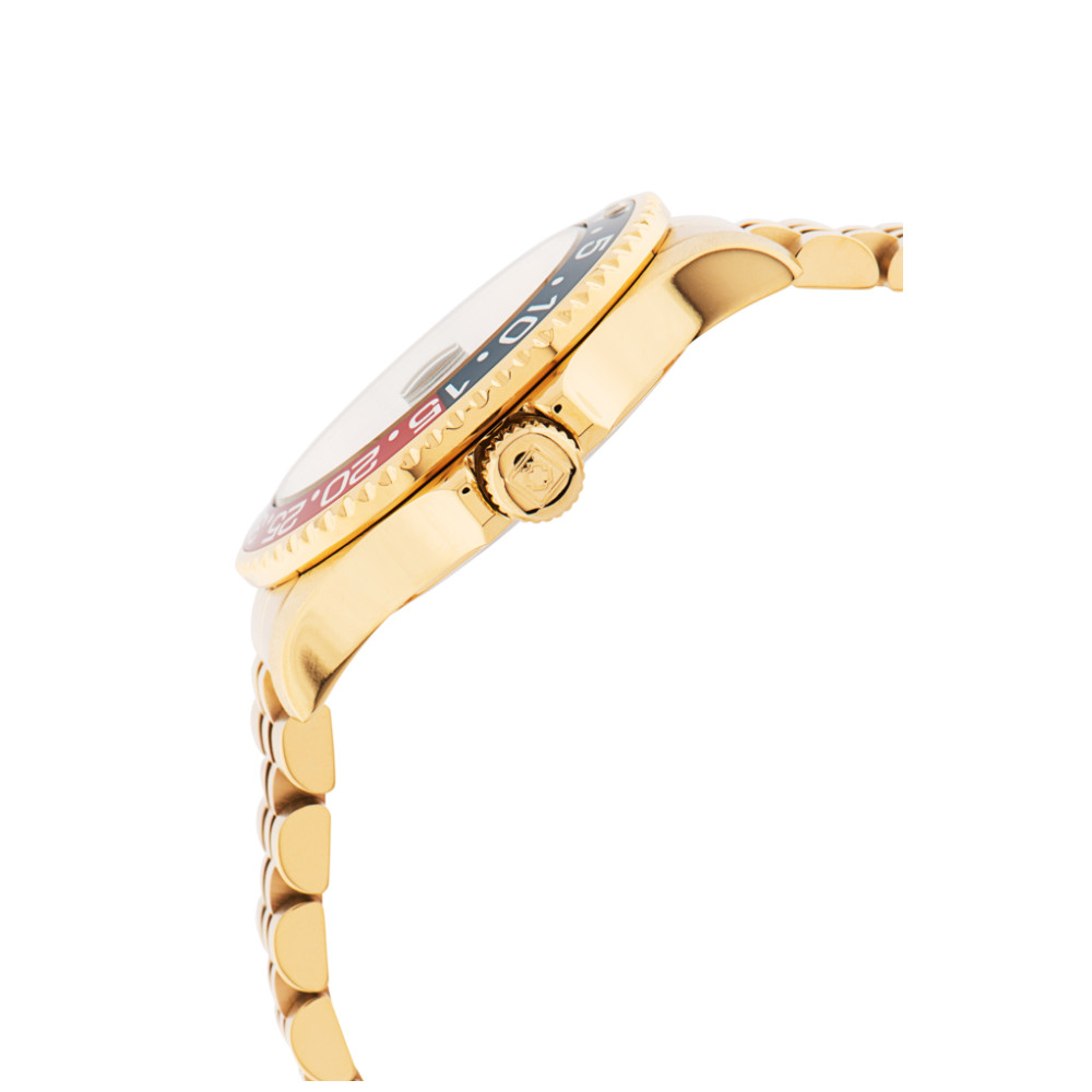 Uma pulseira dourada de ao inoxidvel completa este relgio que pode resistir gua por at 100 m.