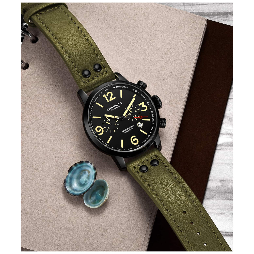 Relgio masculino Stuhrling 3956 com caixa de 45mm, mostrador preto e pulseira de couro preta