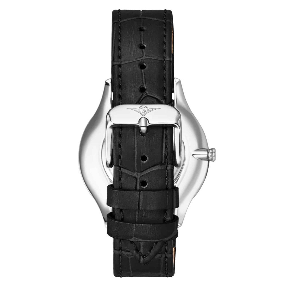 Relgio masculino Stuhrling 3985 com mostrador prateado, pulseira de couro preto e fivela de prata 38mm.