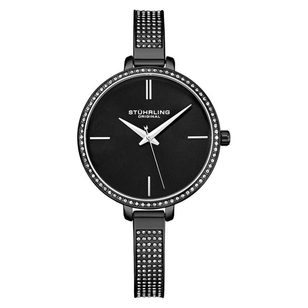 Com um mostrador preto e pulseira em ao inoxidvel preta com fivela, este relgio resistente gua at 30 metros ou 100 ps e possui uma moldura cravejada de cristal que adiciona um toque de brilho e sofisticao.