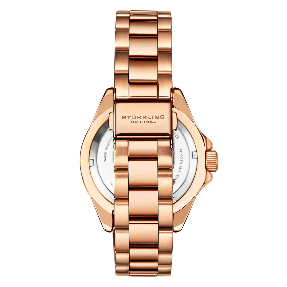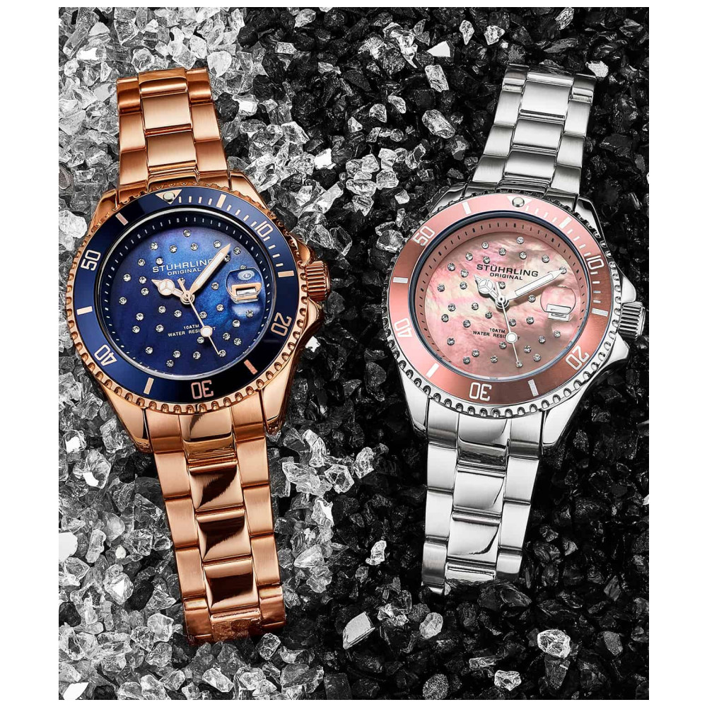 Relgio StarSea 3977 39mm com mostrador azul e pulseira em ao inoxidvel rosa com fivela de implantao dourada em camadas Stuhrling.: O Relgio StarSea 3977 da marca Stuhrling um modelo elegante e sofisticado, perfeito para complementar qualquer look.