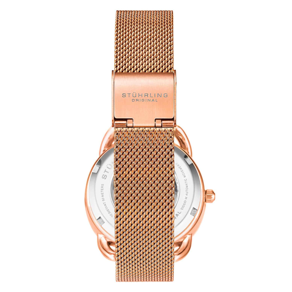 Relgio Stuhrling 3990M Automtico 36mm, mostrador azul, pulseira em ao inox rosa com fivela dobrvel em camadas de ouro rosa.