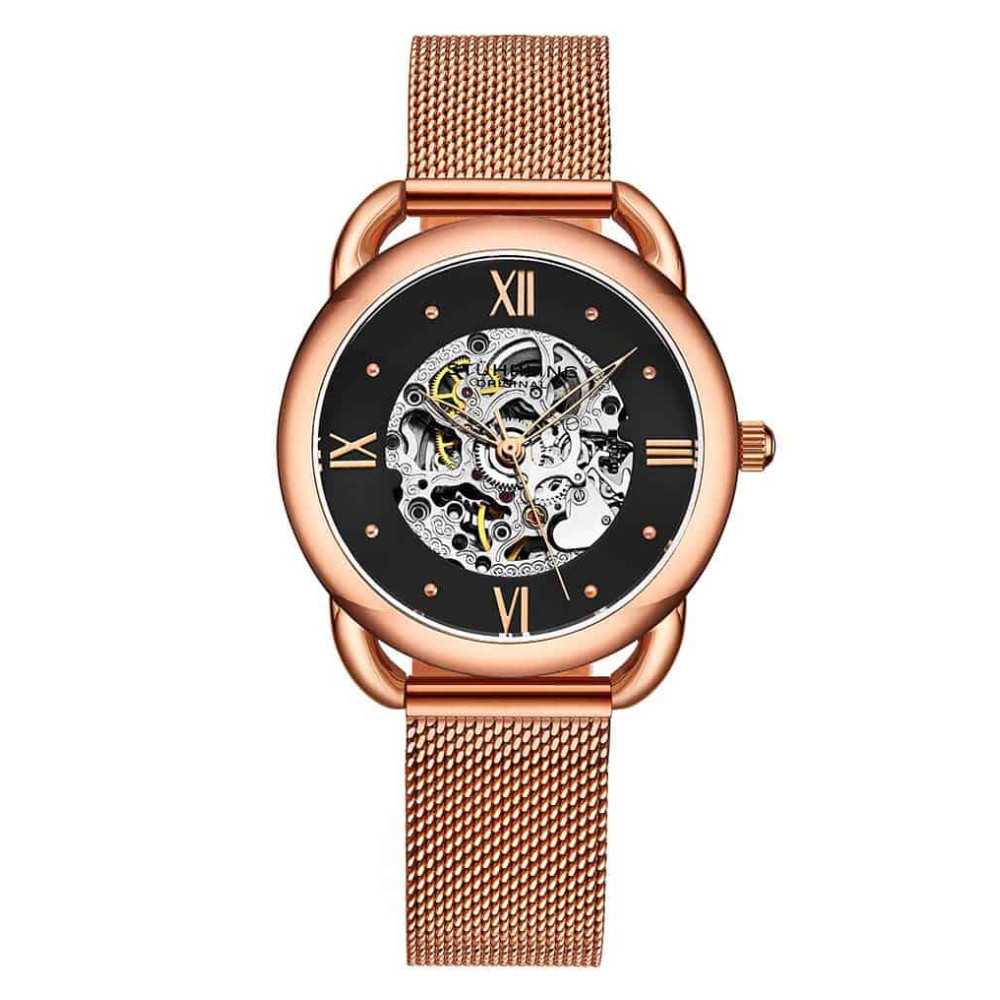 Relgio Stuhrling 3990M Automtico 36mm, Mostrador Preto com Detalhes em Rosa e Pulseira em Ao Inoxidvel com Fivela Dobrvel em Ouro Rosa.