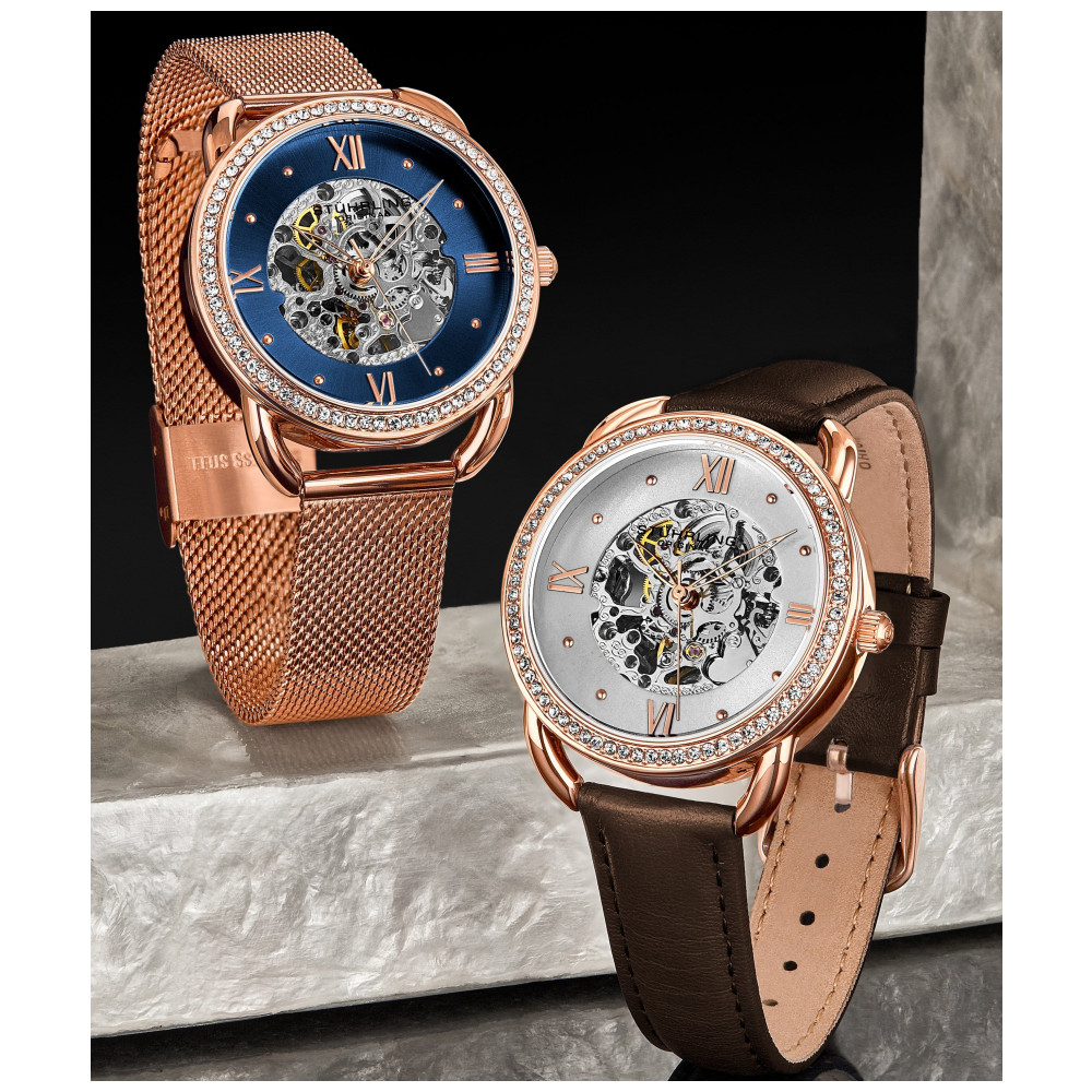 Relgio Stuhrling Automtico 3991 Mostrador Prateado e Rosa, Pulseira de Couro Marrom Escuro e Fivela em Ouro Rosa