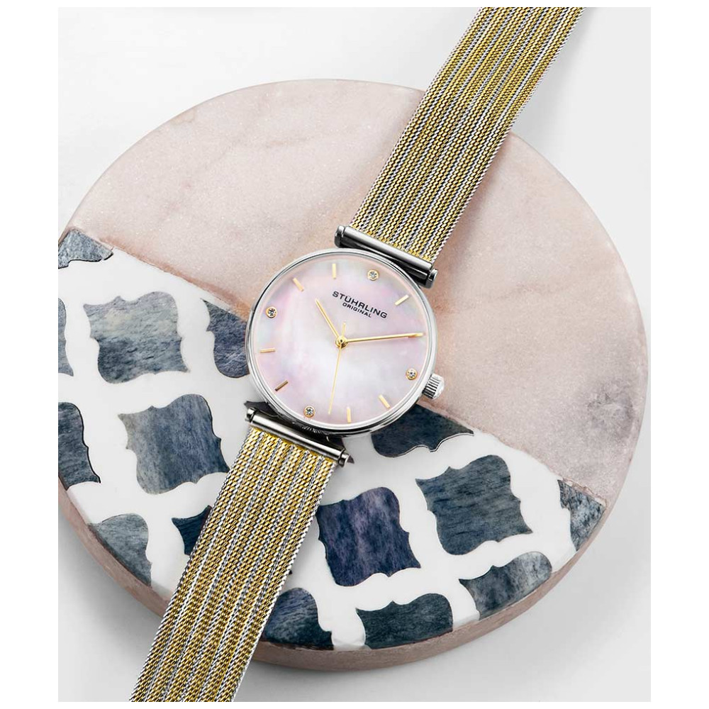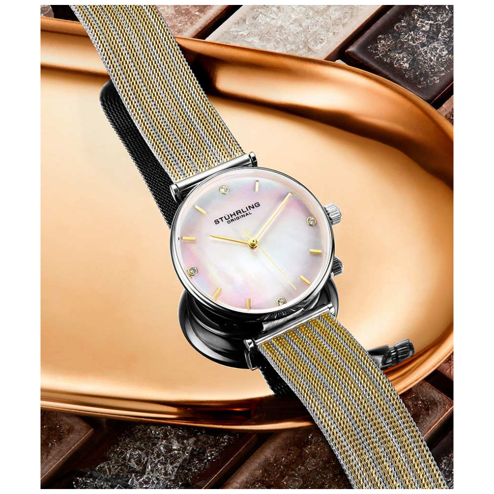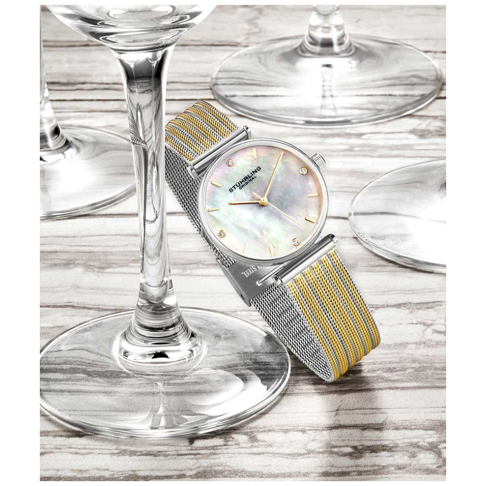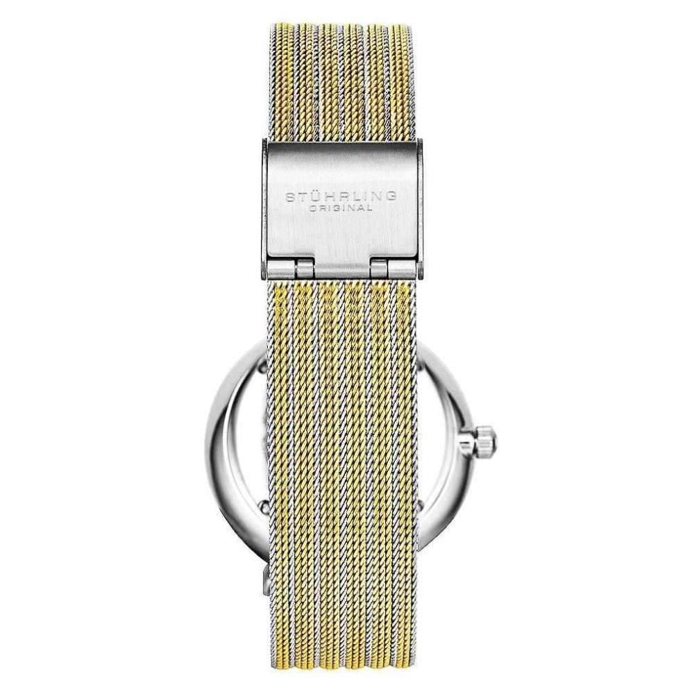 Relgio Stuhrling Cambria 3927, 32mm, mostrador prateado, pulseira em ao inox dourado e fivela dobrvel em prata Clssico e elegante.