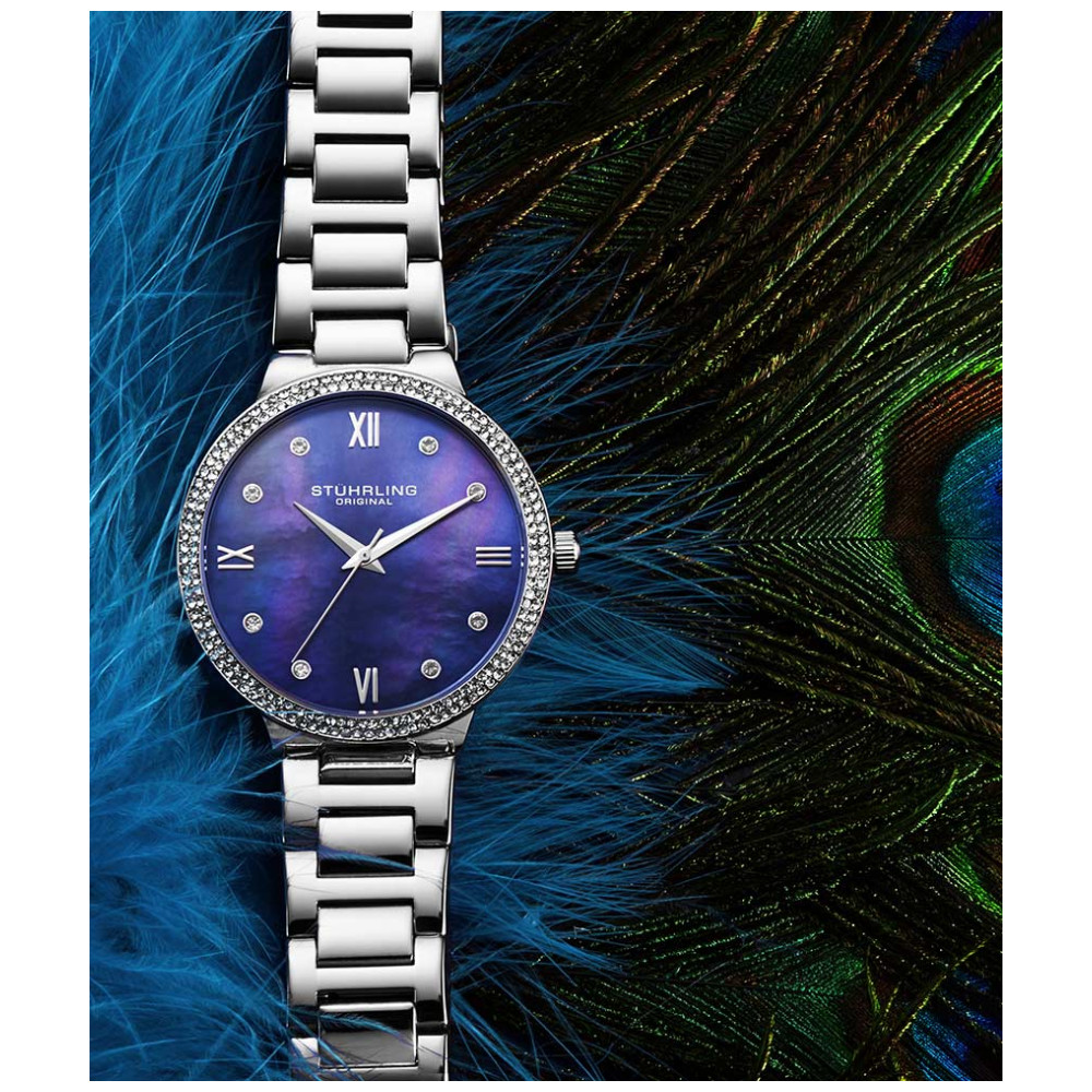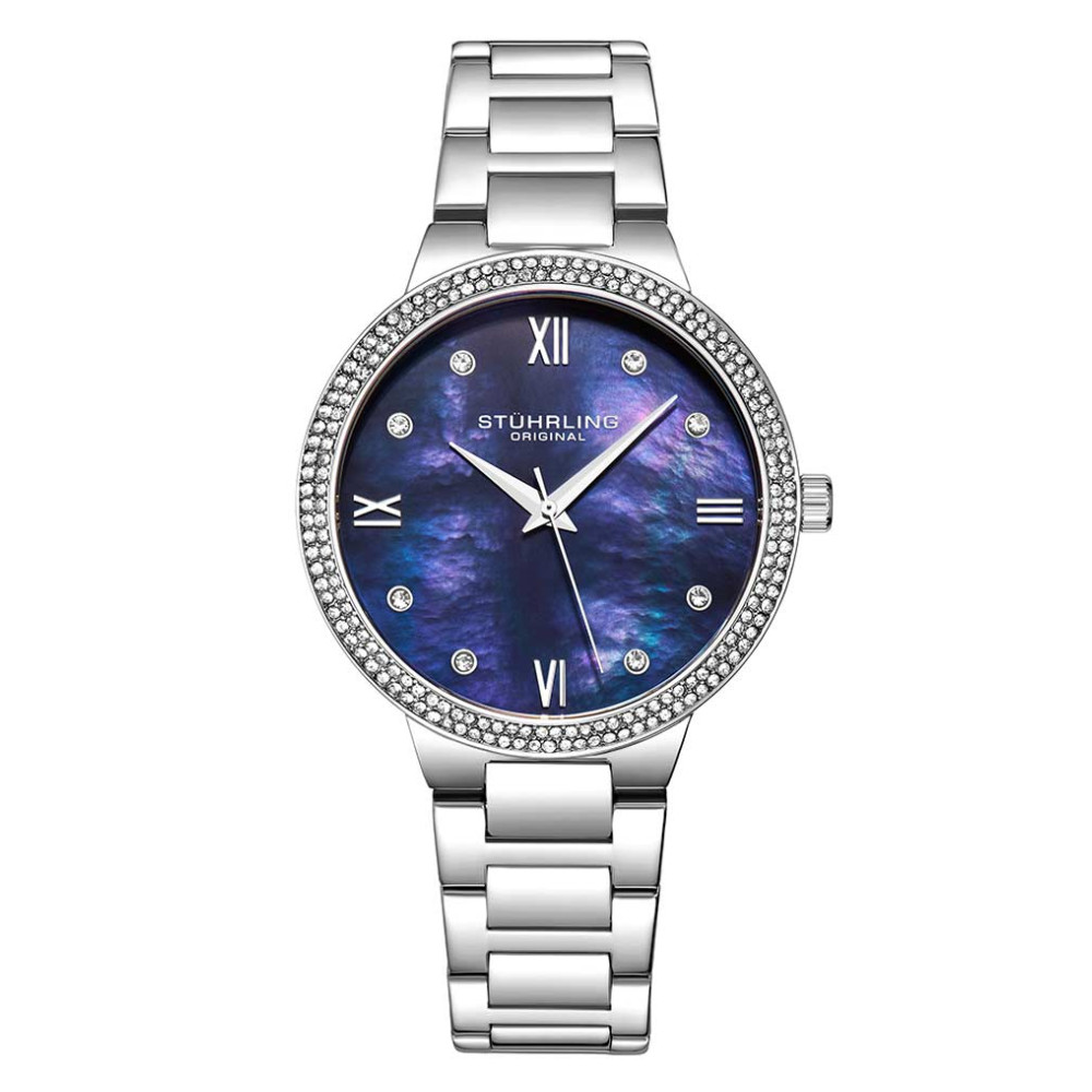 Relgio Stuhrling Carrara 3907 38mm, mostrador azul, pulseira de ao inoxidvel prateado e fivela de implantao prata