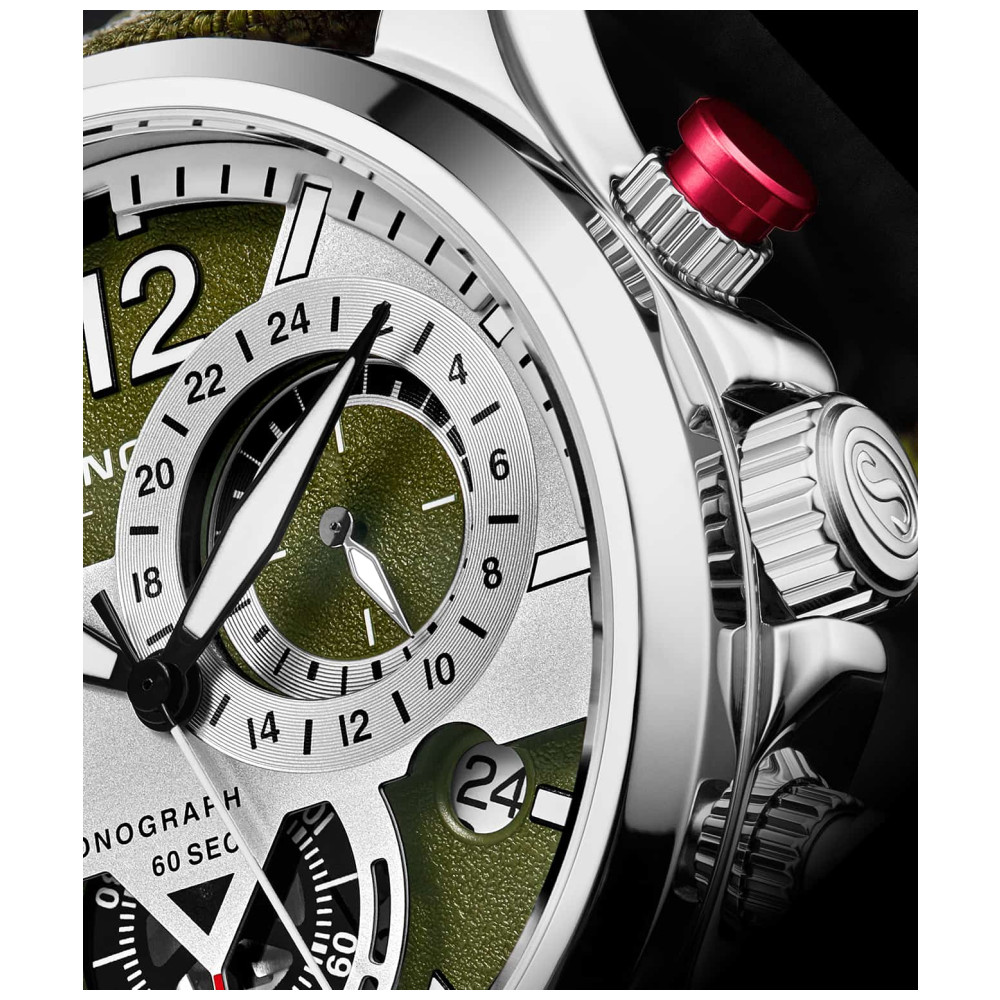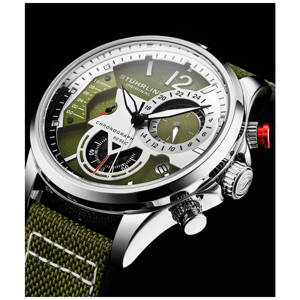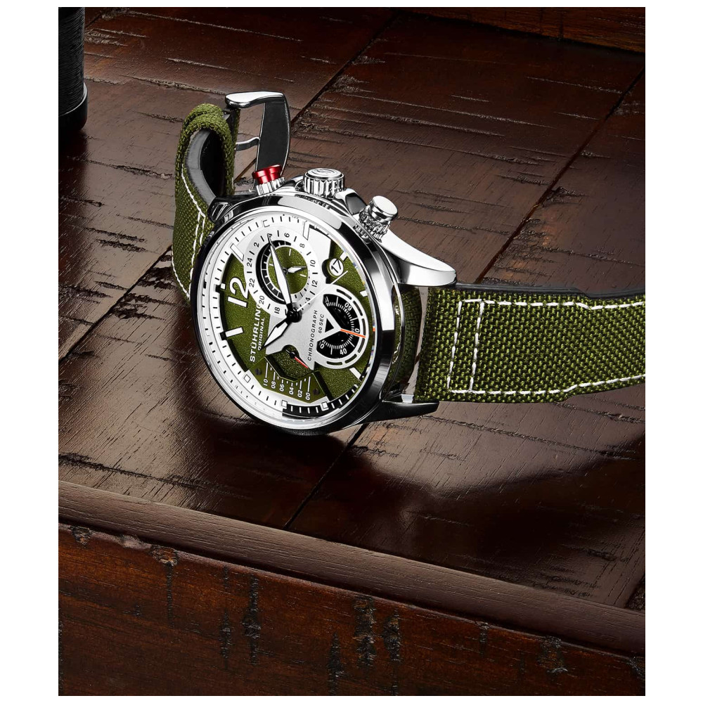 Relgio Stuhrling Cordura 908 Aviador 45mm Verde Prata com Pulseira de Couro Verde e Fivela de Prata